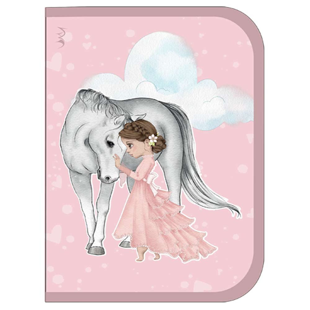 Praktický jednoduchý školský peračníks koňom pre dievčatá značky Reybag Amazing Horse s jednou chlopňou, s gumovými úchytmi na ceruzky a perá, vreckom na suchý zips vhodný na peniaze, gumu a prepážkou s priehľadnou fóliou a rozvrhom hodín.