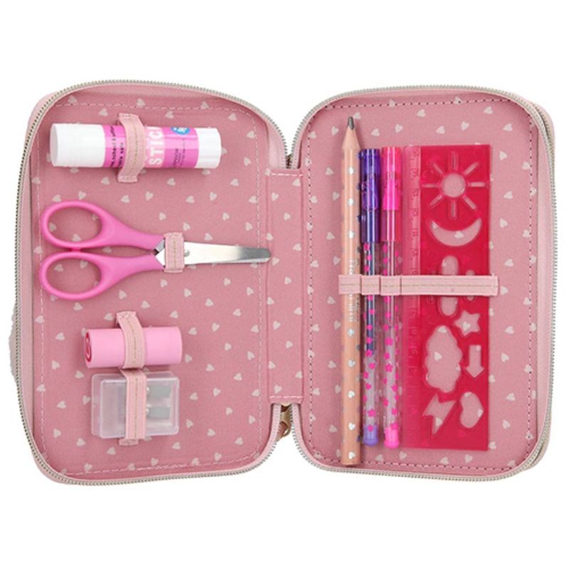 Penál obsahuje: ceruzku, 12 pasteliek, 2 gélové perá, nožnice, lepidlo, pravítko so vzormi, strúhatko a gumu