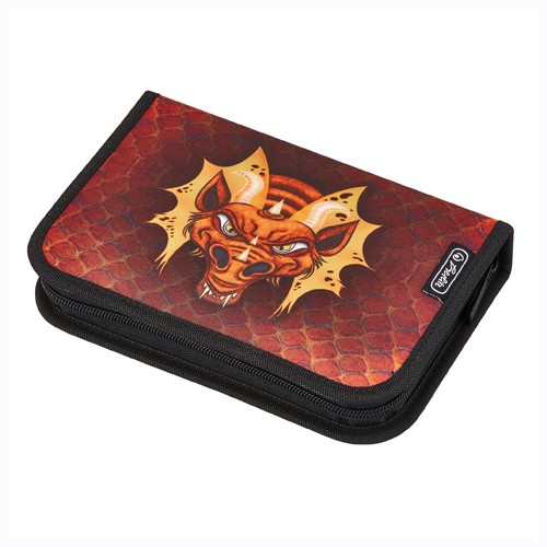 Vybavený školský peračník s dvoma klopami a písacími potrebami značky Herlitz. Na oboch stranách klopy je fólia pre umiestnenie rozvrhu.