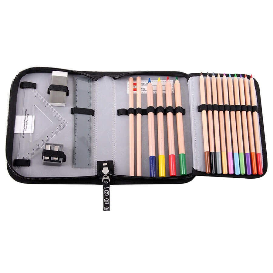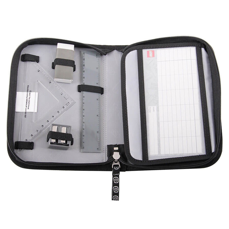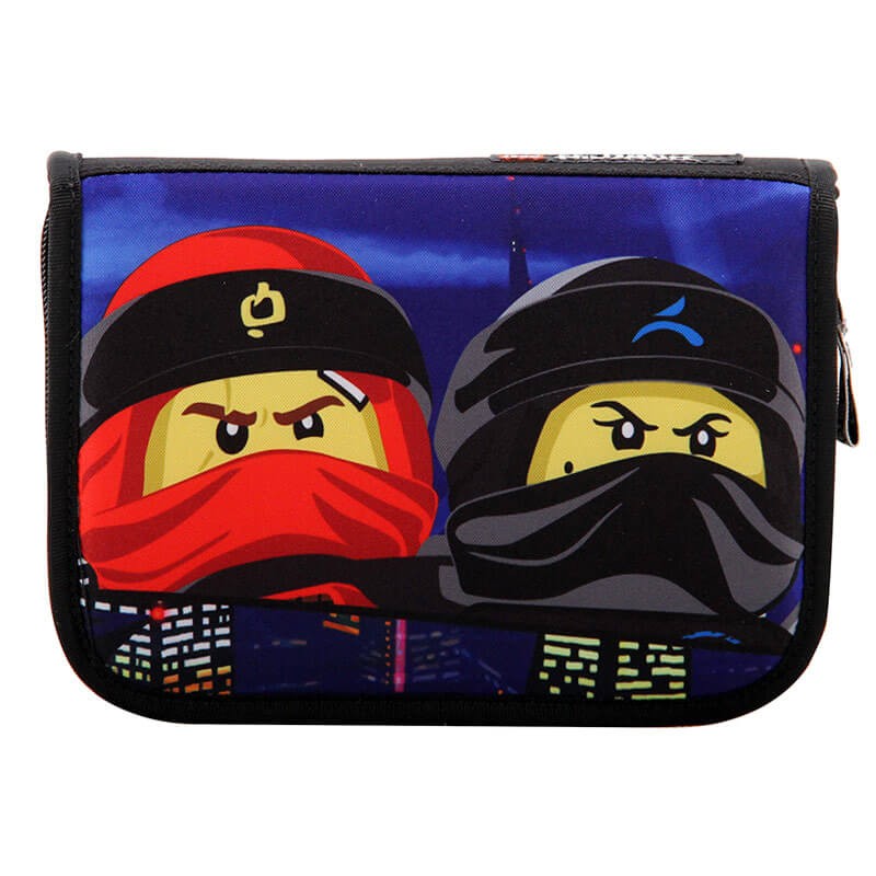 Jednoposchodový vybavený peračník s jednou klopou s LEGO® motívom. Peračník obsahuje 2 trojhranné ceruzky, 10 trojhranných tenkých pasteliek, 4 trojhranné silné pastelky, strúhatko, gumu, pravítko 15 cm a malý trojuholník. Ďalej štítok na meno a telefón a rozvrh hodín.