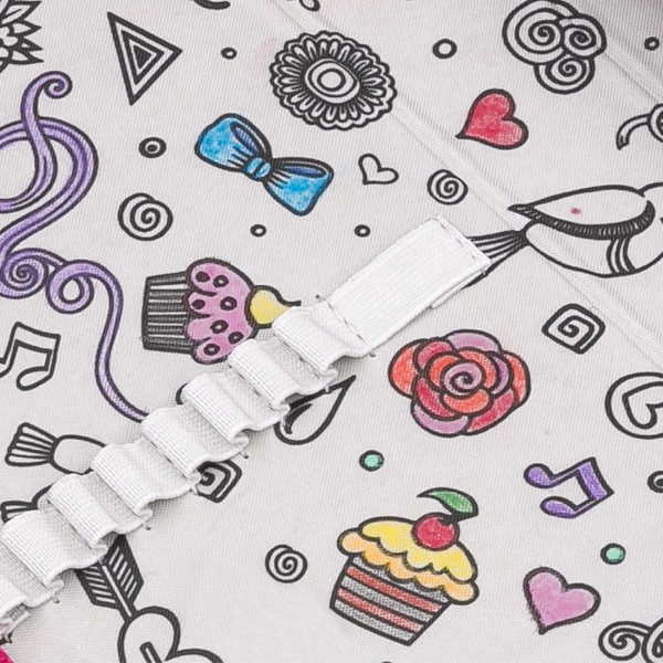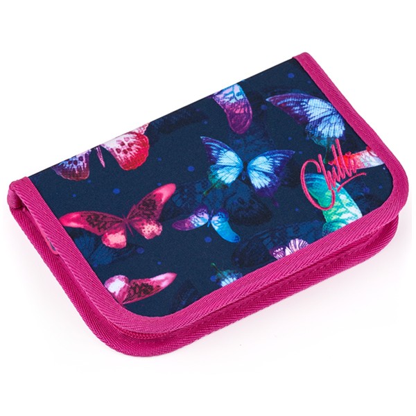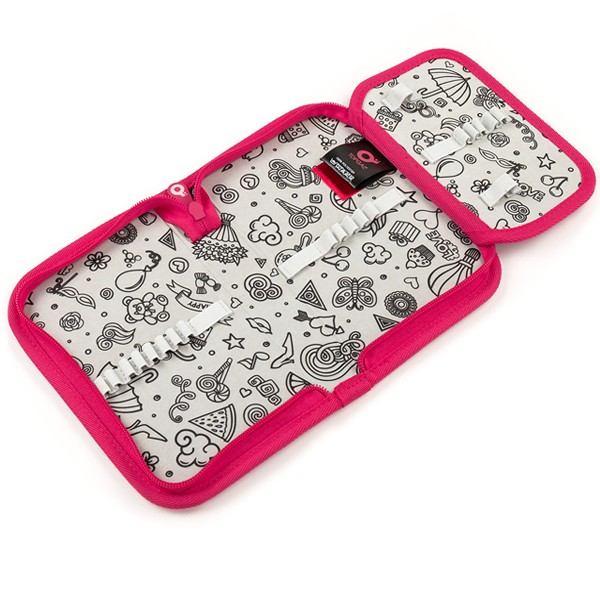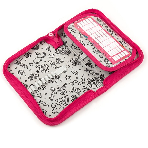Dievčenský jednokomorový školský peračník, nevybavený, polstrovaný pre ochranu písacích potrieb. Vnútri je peračník vybavený 18 gumovými úchytmi na pastelky a fixky, 4 širšími úchyty na pravítka, kružidlo či nožnice a 2 väčšími úchyty na gumu a strúhadlo, jedna chlopňa peračníku je doplnená priehľadnou fóliou na rozvrh hodín. Zapínanie tvorí kvalitné zipsy s veľkými ťaháčikmi. Vnútorné podešívkou peračníka zo šedej látky je potlačená obrazcami, ktoré sa dajú pastelkami vyfarbiť.