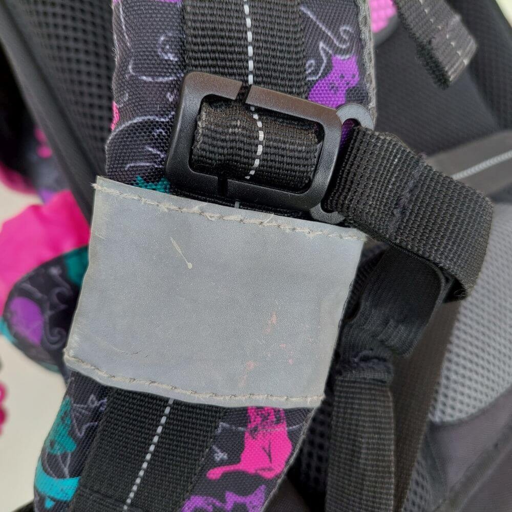 Taška javí známky užívania, nemá ale žiadne funkčné vady. Ľavý reflex na ramennom popruhu a zapínanie aktovky ľahko zašpinené. Prasknutý reflex na bočných vreckách.