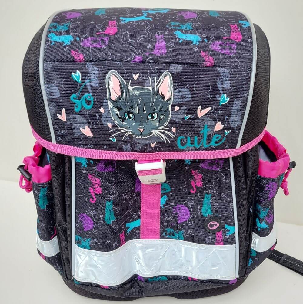 Kvalitná jednokomorová dievčenská aktovka s motívom mačičky vhodná pre drobných prváčikov až 3. třídu ZŠ. Jednokomorová priestranná školská aktovka má jednu separačnú kapsu pre lepšiu prehľadnosť, prednú kapsu na penál alebo svačinu a jednoduché zapínanie pomocou magnetickej spony zn. FIDLOCK.