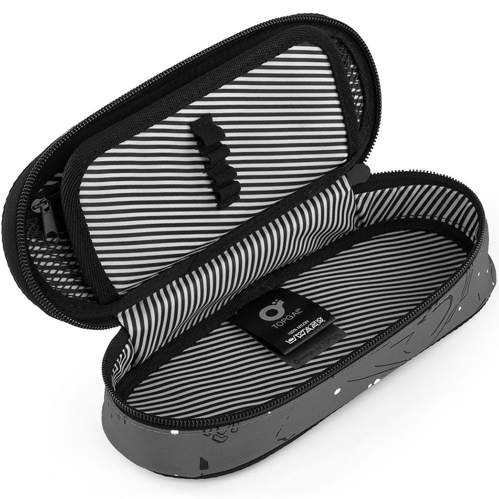 Vnútri púzdra nájdete sieťovú kapsičku na zips a klopu s deviatimi gumičkami. Voľný priestor pod chlopňou umožňuje umiestniť ďalšie písacie potreby. Vďaka polstrovaniu sa ceruzky a pastelky zaručene nedolámu! Zipsy majú veľké ťaháčiky, tým pádom je ich obsluha bezproblémová.