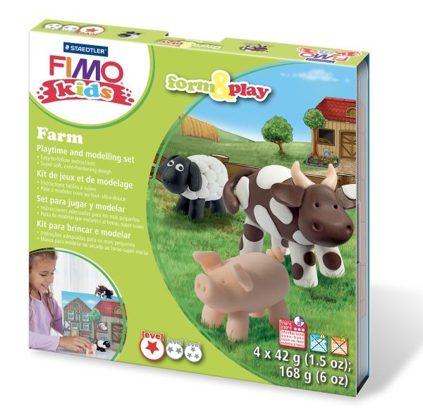 Sada FIMO kids "form & play" umožňáuje vytvárať rôzne tematické svety podľa detailných a deťom zrozumiteľných pokynov a vytvoriť si tak svoj vlastný príbeh vo svete hier, ktorý si vlastnoručne vyrobili. Bez ohľadu na množstvo skúseností s modelovaním, ktoré deti majú, každý si môže vybrať svoju úroveň obtiažnosti (1 = ľahké, 2 = stredne ťažké, 3 = ťažké) a dostane detailný, zrozumiteľný návod ako postupovať krok za krokom s množstvom obrázkov. Obrázky zodpovedajú obtiažnosti danej sady. Každá sada obsahuje štyri balenia FIMO Kids, pozadie, ktoré sa hodí k danej téme a brožúrku s návodom. Modelovacia hmota je skladovaná čisto a bezpečne chránené od špiny a prachu v znovu uzatvárateľnej krabici.