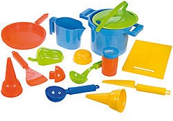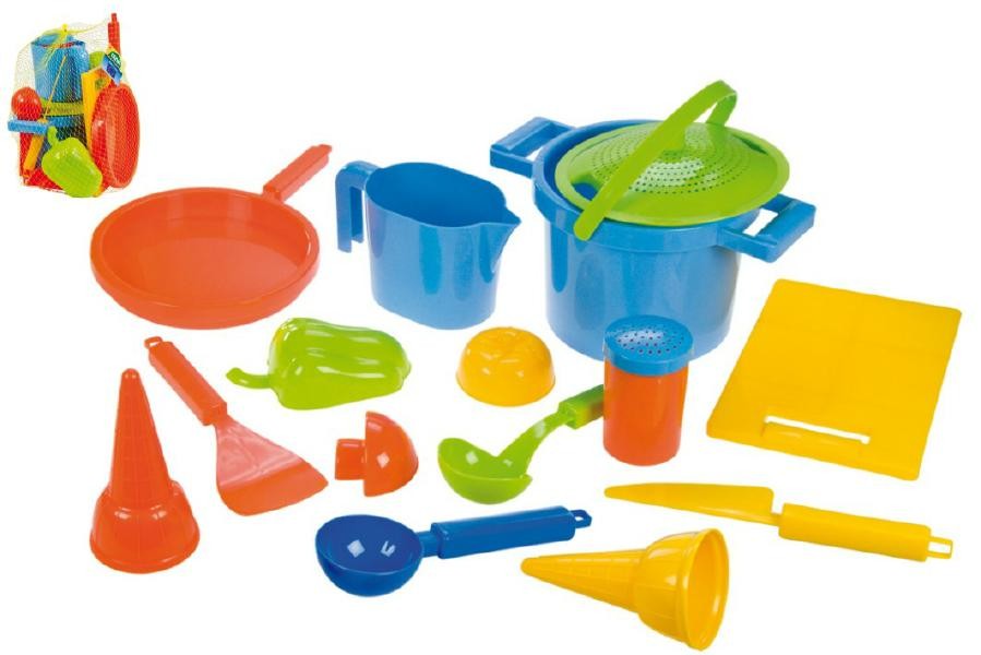Set na piesok na varenie obsahuje všetko, čo malý kuchár potrebuje. Sadu tvoria. sítko, pokrievka, hrniec, 3x zelenina, soľnička, naberačka, obracačka, nôž, dostička, panvička, odmerka, kornútok, zmrzlinová naberačka.