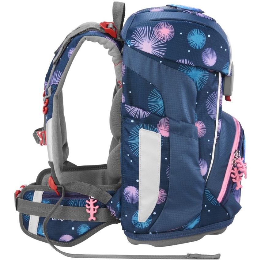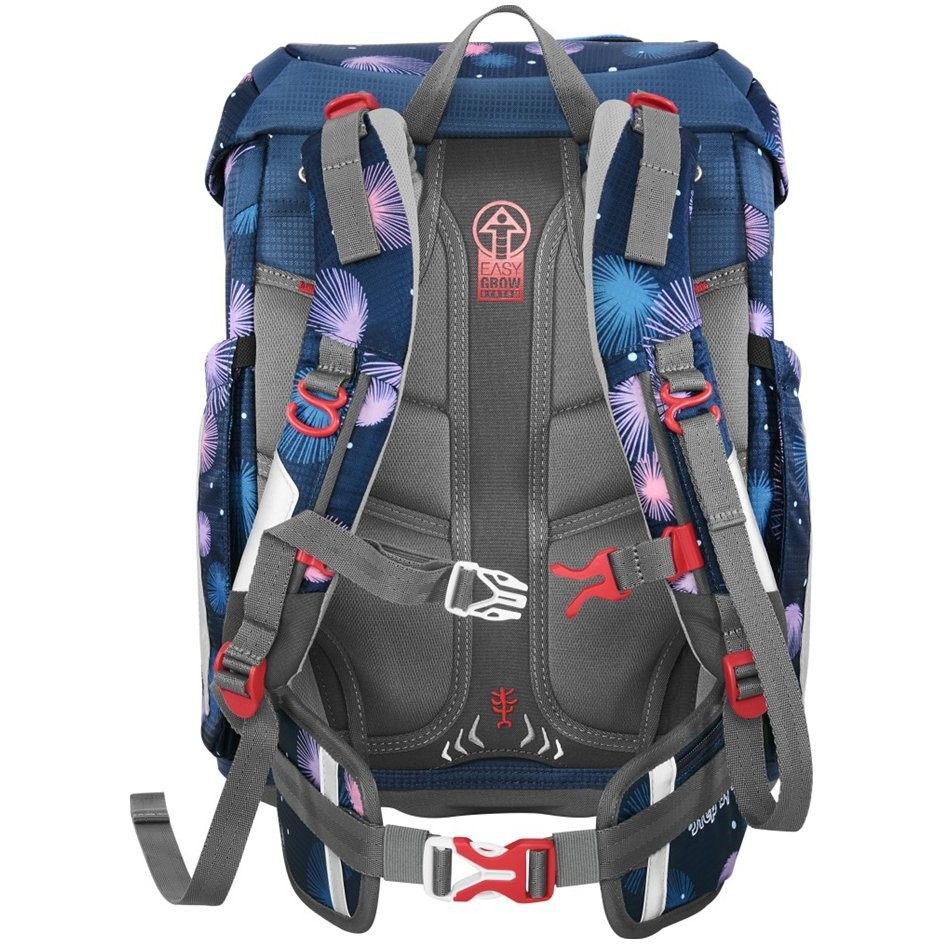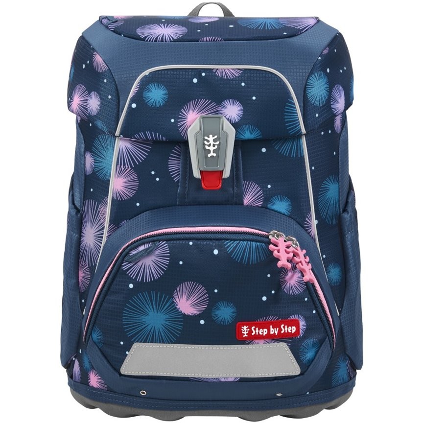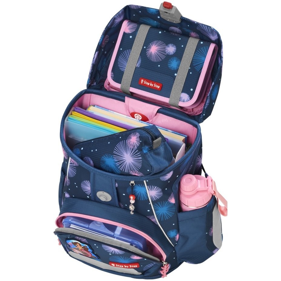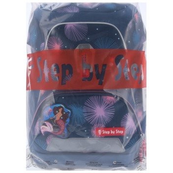 Školská taška pre prváčikov má hmotnosť iba 990 g a je vhodná pre deti od 100 do 150 cm výšky. Aktovka má vymeniteľné obrázky MAGIC MAGS a EASY GROW SYSTEM, čo znamená, že taška rastie s dieťaťom (aktovka je vhodná pre deti od 1. do 4. triedy). Ultraľahký chrbtový panel zo sklených vlákien, ergonomicky tvarovaný chrbát s priedušným polstrovaním a nastaviteľné a ergonomické ramenné popruhy sú pri aktovke Step by Step samozrejmosťou. Aktovka disponuje tiež doťahovacími pásikmi pre tesné doliehanie aktovky k chrbtu, odnímateľným, výškovo nastaviteľným hrudným popruhom, úchytmi na koncoch ramenných popruhov a polstrovaným, odnímateľným bedrovým pásom s malým bočným vreckom na zips. Predné vrecko s termoizolačnou vrstvou a odtokovými otvormi je ideálne na uloženie desiaty. Otvorené bočné vrecká rastúce smerom von s odtokovými otvormi a pútko na nosenie/ zavesenie. Aktovka sa zatvára na magnetický uzáver FIDLOCK. Hlavné vrecko s vnútorným vreckom je vhodné pre ťažšie predmety (knižky, dosky na zošity), vďaka gumičke v klope je v aktovke viac miesta vďaka úspornému uloženiu peračníka. Vodeodolné pevné dno a skrytá priehradka na AirTag. Reflexné prvky pre väčšiu bezpečnosť v cestnej premávke, v šere av tme.