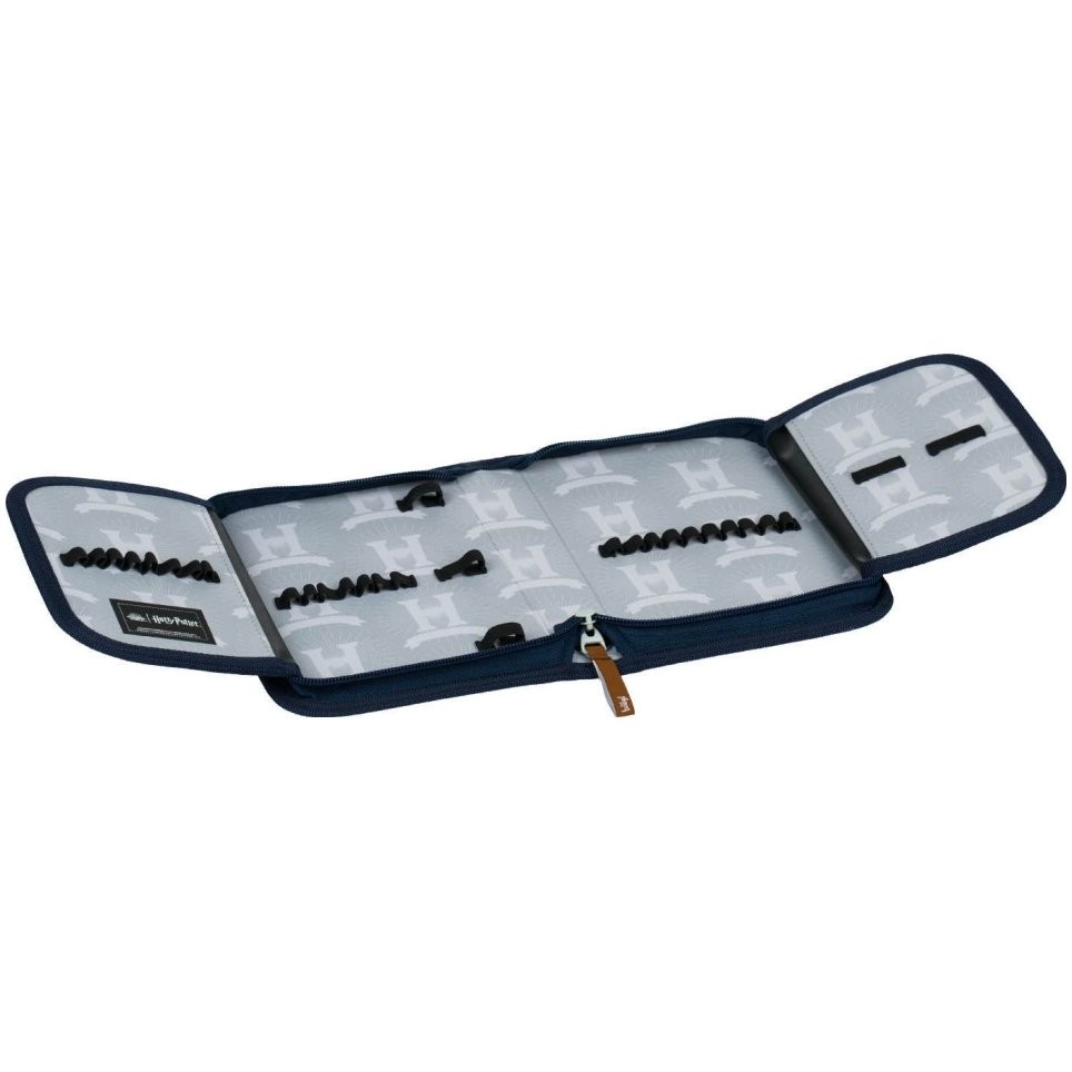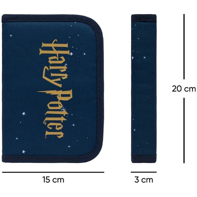 Jednopatrový školský peračník Baagl s dvoma chlopňami s motívom Harry Potter, prázdny. Obsahuje 25 gumových pútok na úschovu písacích potrieb a 5 širších gumových pútok na ďalšie školské potreby (guma, strúhadlo, pravítko). Na rube klopy priehľadná fólia na založenie rozvrhu hodín.