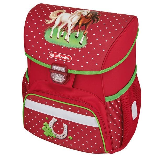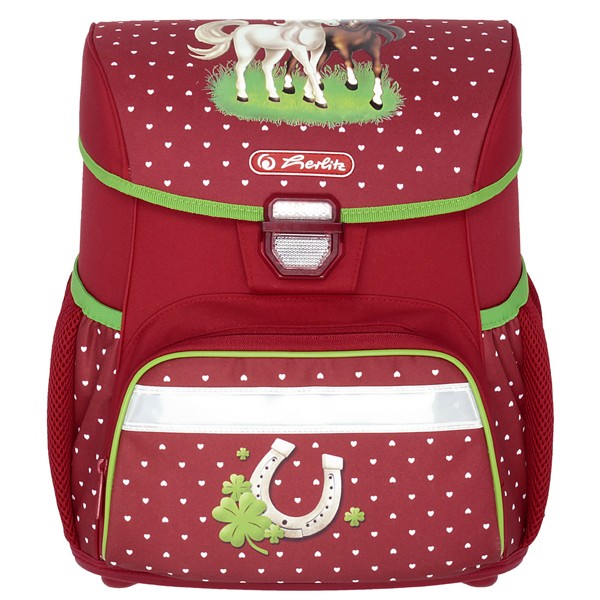Ergonomicky tvarované priedušné polstrovanie chrbta a ramenných popruhov zaručuje pohodlné nosenie aktovky. Jednu hlavnú, prehľadnú komoru delí pohyblivá prepážka určená napr. na dosky na zošity. Bočné vrecká sú zo sieťoviny a pojmú aj zdravé fľaše 0,5 l, predné vrecko je vhodné na krabičku s desiatou. Klopu a predné vrecko zdobí potlač s motívom koní.