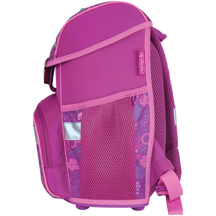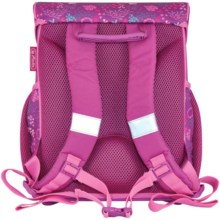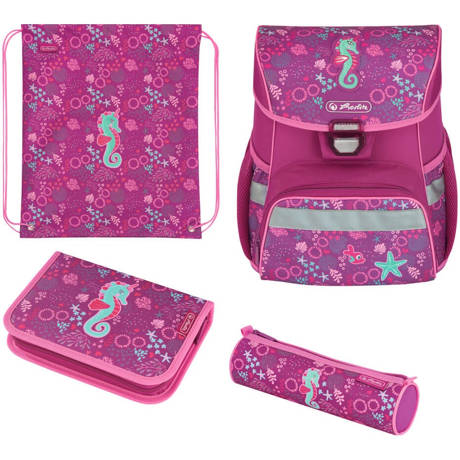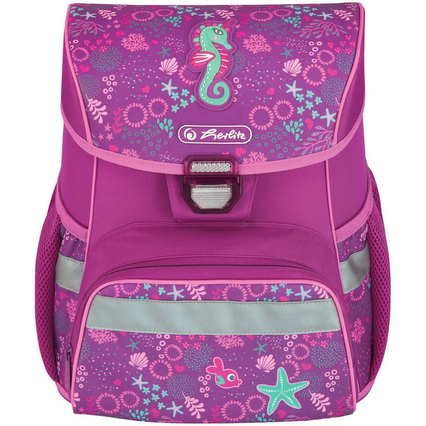 Jednokomorová školská aktovka Herlitz Loop je ladená do ružova a zdobí ju obrázok morského koníka. Tašky Loop radi ponúkame rodičom menších prváčikov, ktorým krásne sedia na chrbte. Ďalšou veľkou prednosťou tejto aktovky je jej nízka hmotnosť. Priedušná chrbtová časť s ergonomicky tvarovaným polstrovaním zaisťuje vysoký komfort pri nosení. Výškovo nastaviteľné anatomicky tvarované ramenné popruhy slúžia pre správne usadenie tašky na chrbte. Integrovaný hrudný popruh napomáha, aby taška neskĺzala z ramien. Veľká hlavná komora aktovky je rozdelená textilnou prepážkou pre stabilné uloženie učebníc a zošitov. Bočné vrecká sú čiastčne zo sieťoviny a pojmú zdravé fľaše 0,5 l. Predné vrecko na zips je ideálne pre uloženie desiatového boxu. Pre zvýšenie bezpečnosti dieťaťa za šera alebo nepriaznivého počasia je aktovka zo všetkých strán opatrená reflexnými prvkami.