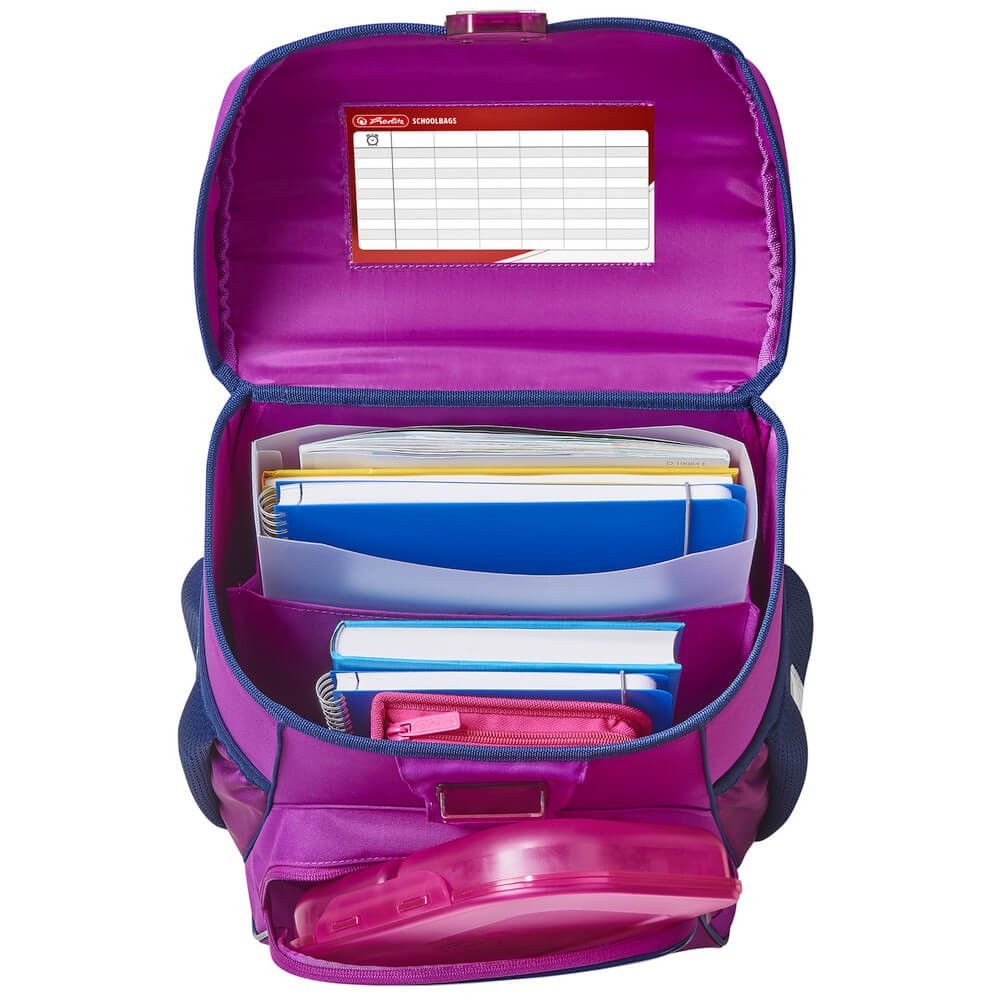 Vybavený školský peračník s dvoma klopami a písacími potrebami značky Herlitz. Na oboch stranách klopy je fólia pre umiestnenie rozvrhu.