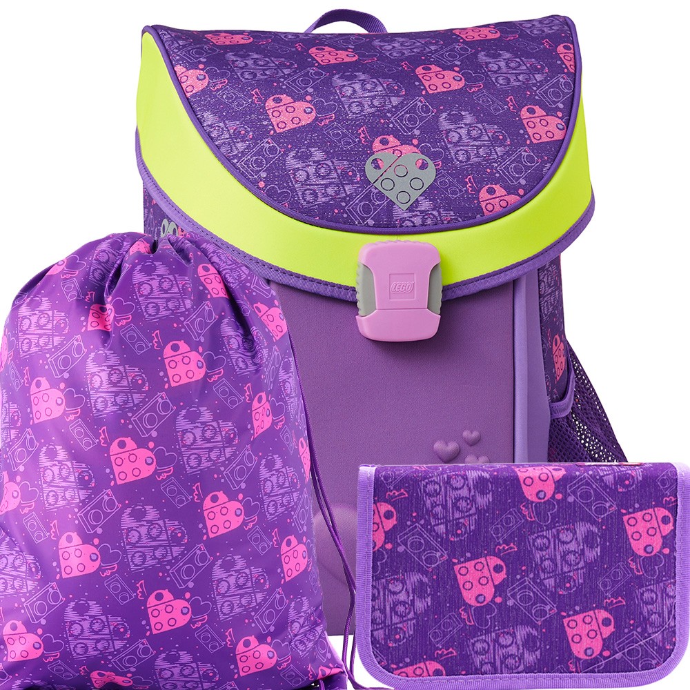 Ľahká a priestranná školská aktovka s licenčným motívom LEGO® Friends vhodná pre prváčikov až tretiu triedu základnej školy. Set sa skladá z tašky, peračníka a vrecka na cvičky rovnakého motívu. Taška ponúka dostatok priestoru pre všetky potrebné knihy a zošity, fľašu i desiatový box. Popis aktovky: atraktívny dizajn s LEGO® motívom ľahká konštrukcia, hmotnosť len 790 g ergonomicky tvarovaný chrbát veko s plastovým zámkom, priestorné hlavné vrecko nastaviteľné, polstrované ramenné popruhy s reflexnými prúžkami pre väčšiu bezpečnosť predné vrecko na peračník nastaviteľný hrudný popruh vystužené dno s nožičkami pre lepšiu stabilitu a ochranu pred špinou a vlhkom priehradka pre ťažšie predmety, ktorá ich udrží u chrbta a zaistí rovnomerné rozloženie hmotnosti klip na kľúče, rozvrh hodín a štítok na meno vnútri aktovky 2 bočné sieťované vrecká napr. na fľašu na pitie 0,5 l Rozmery: 39 x 29 x 22 cm Hmotnosť: 790 g Objem: 18 l Materiál: 300D / 600D Polyester Peračník: Jednokomorový školský peračník s jedným výklopným krídlom s 22 pútkami a jedinečnou náplňou (2 ceruzky, 10 pasteliek, 4 široké pastelky, guma na gumovanie, strúhatko, 2 pravítka). Na rube klopy priehľadné vrecko s rozvrhom hodín. Rozmery: 20 x 14 x 4 cm Hmotnosť: 320 g Materiál: 300D / 600D Polyester Vrecko na cvičky: Ľahké vrecúško na cvičky, šport či voľný čas. Ľahko sa otvára a zatvára. Bezpečnostná poistka rozopne popruhy pri silnom zatiahnutí. Vrecko je vyrobené z odolného materiálu bez použitia PVC. Rozmery: 42 x 34 cm Hmotnosť: 100 g Objem: 11 l Materiál: 210D Polyester