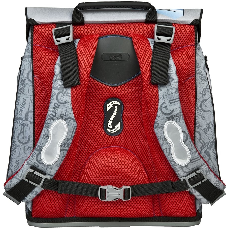 Po odklopení hornej klopy máte k dispozícii veľkú komoru s pohyblivou prepážkou, ktorá slúži na uloženie ťažších predmetov bližšie k chrbtu. Vnútri hlavnej komory nájdete na jej chrbtovej časti menšiu zipsovú kapsičku, na vnútornej klope priehľadnú fóliu s rozvrhom. Pod klopou tašky je prišitý krúžok pre kľúče s dračím plastovým príveskom. Na uloženie desiatového boxu je určené predné zipsové vrecko, pre užšiu fľašu slúžia postranné zipsové vrecká. Pevné plastové dno chráni batoh pred ušpinením.
