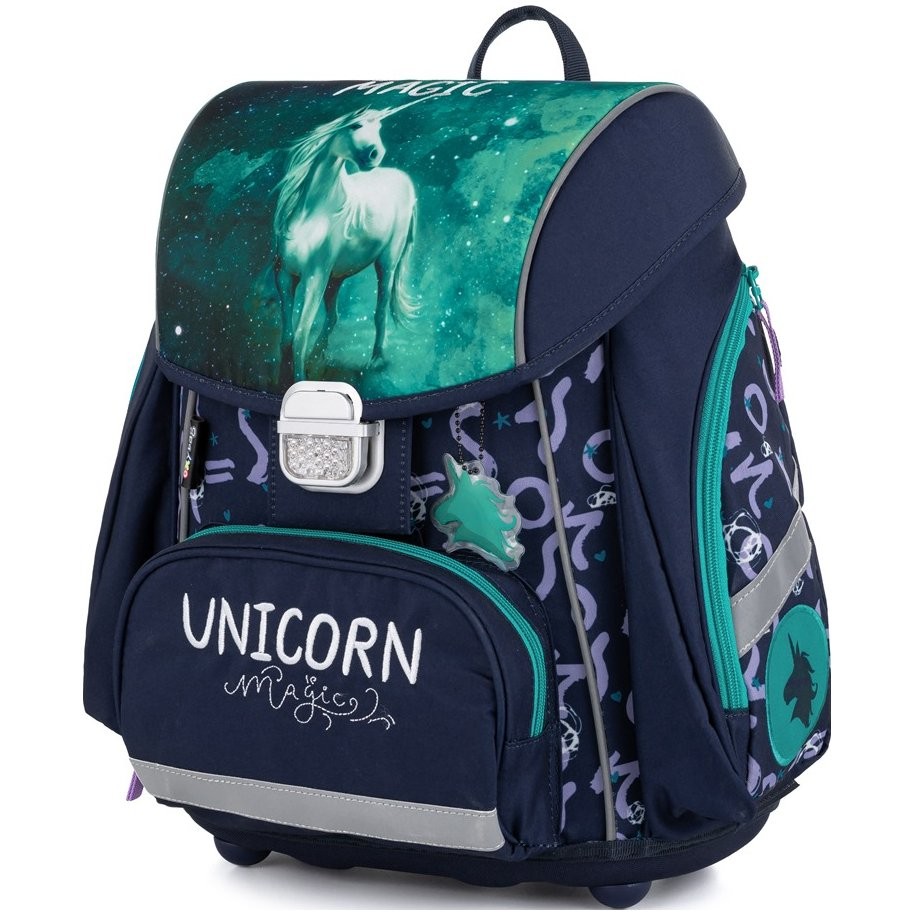 Dievčenská školská taška Premium Unicorn je vhodná pre štandardne vysokých prváčikov a na chrbte pekne sedí. Má anatomicky tvarovaný chrbát a širšie mäkko polstrované ramenné popruhy, ktoré sú tvarovo prispôsobené postave detí. Popruhy tak lepšie priľnú k ramenám a pomôžu ich rovnomerne zaťažiť. Polstrovanie chrbtovej časti je z príjemného priedušného materiálu a svojím tvarom umožňuje dostatočné odvetrávanie. Dieťa sa teda pod batohom len tak nespotí. Bezpečnosť detí je podporená reflexnými prvkami zo všetkých strán vrátane odrazky na zámku.