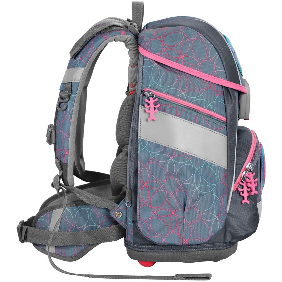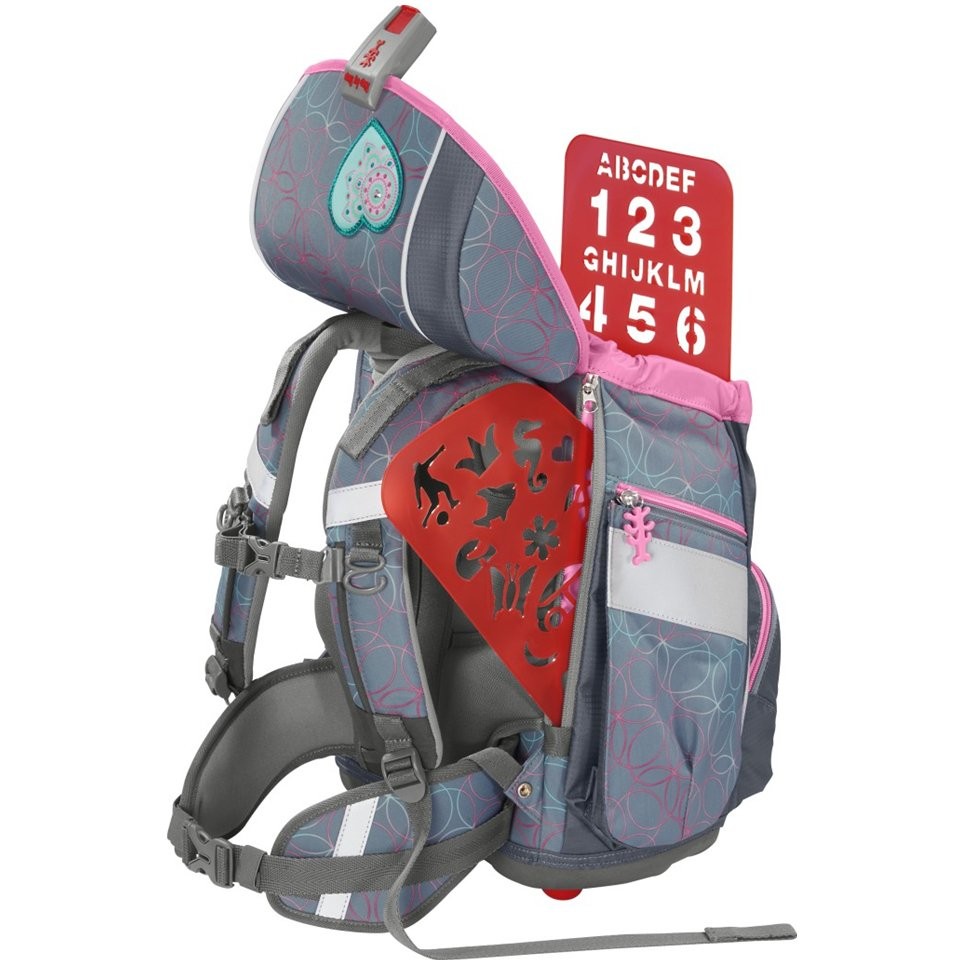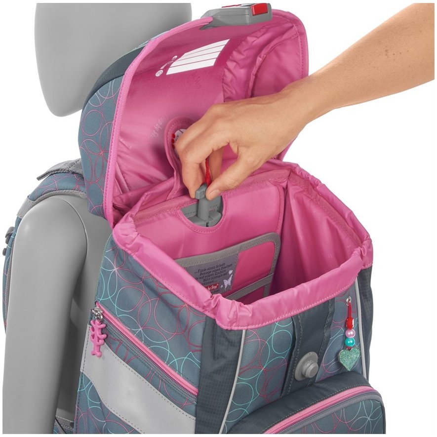- možnosť plynulého výškového nastavenia ramenných popruhov pomocou otočného mechanizmu vo vnútri aktovky, zaisťuje presné nastavenie ramenných popruhov priamo na chrbte dieťaťa