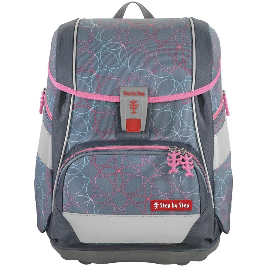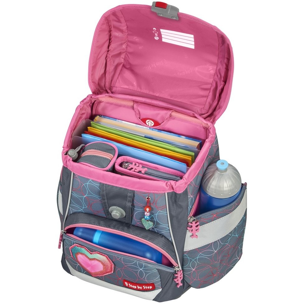Aktovka pre prváka Step by Step Glitter Heart, ktorá je vhodná od 1. do 4. triedy ZŠ. 6dielny set obsahuje: aktovka do školy, vybavený peračník pre prvákov, puzdro, vrecko na cvičebný úbor alebo prezuvky, šablóny a vymeniteľné obrázky Magic Mags.