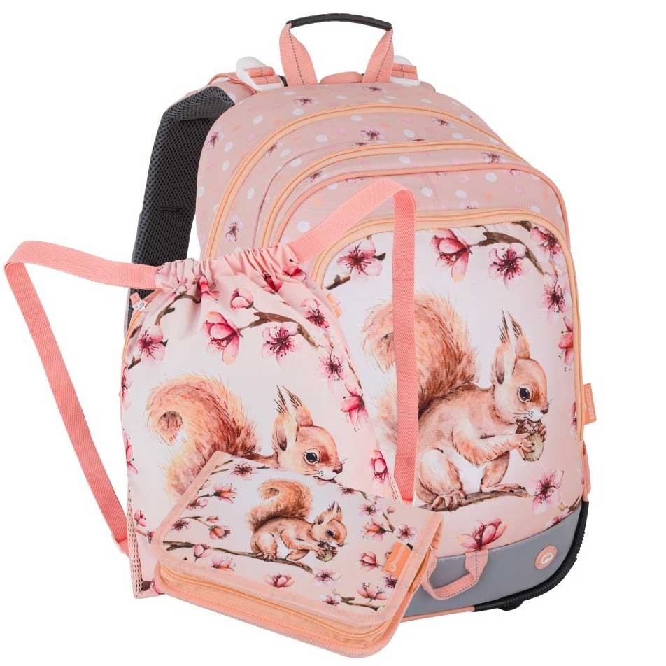 Kvalitný trojkomorový dievčenský batoh do školy s veveričkou pre 1. – 3. ročník ZŠ. Do prvého ročníka vhodný iba pre vyššie dievčatá (cca od 128 cm).