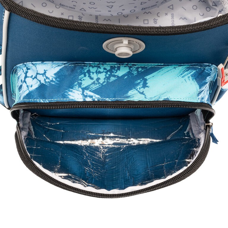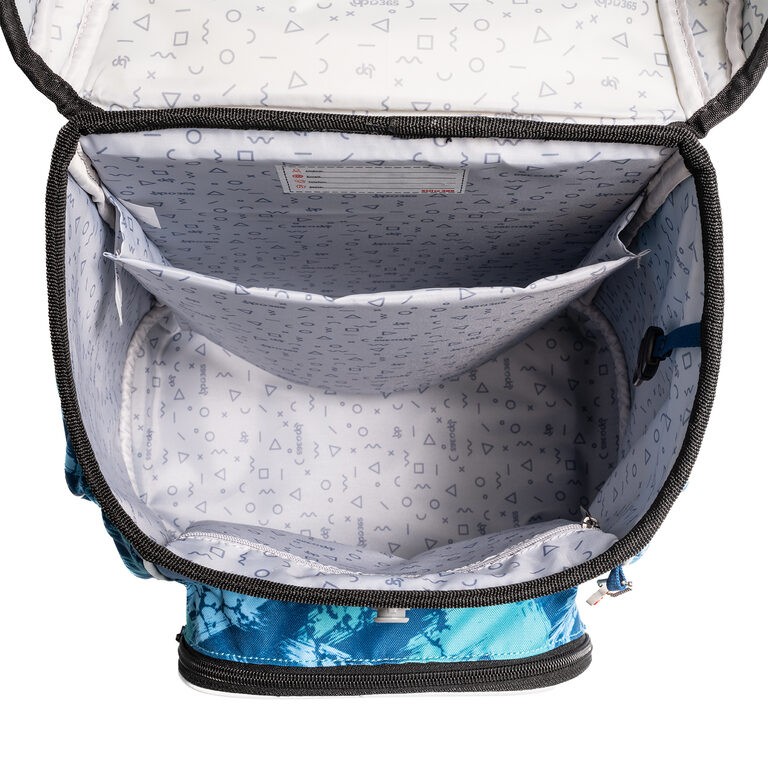 VNÚTORNÉ USPORIADANIE – priestranná hlavná vnútorná komora je rozdelená látkovou prepážkou na uloženie boxu na zošity či knihy. Súčasťou hlavnej komory je aj vrecko na drobnosti, odnímateľný krúžok na kľúče a štítok na meno a adresu. Vo veku sa nachádza priehľadné vrecko na rozvrh hodín. Vrecko na desiatový box je čiastočne termoizolačné, aby si jedlo dlhšie udržalo svoju teplotu. Po oboch stranách batohu sa nachádzajú vrecká na dáždnik alebo fľašu s nápojom. Vrecká svojím umiestnením a elastickými okrajmi pomáhajú eliminovať riziko rozliatia nápoja a poškodenia obsahu aktovky.