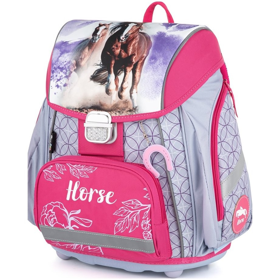 Školská aktovka PREMIUM s motívom běziacich koní vhodná pre dievčatá v 1. a 2. triede. Je ozdobená príveskom v tvare podkovy. Aktovky OXYBAG sú výnimočné svojimi originálnymi licenčnými aj nelicenčnými motívmi a prváčikom na chrbte pekne sedia. Majú anatomicky tvarovaný chrbát a širšie mäkko polstrované ramenné popruhy, ktoré sú tvarovo prispôsobené postave detí. Popruhy tak lepšie priľnú k ramenám a pomôžu ich rovnomerne zaťažiť. Polstrovanie chrbtovej časti je z príjemného priedušného materiálu a svojím tvarom umožňuje dostatočné odvetranie. Dieťa sa teda pod batohom len tak nespotí. Bezpečnosť detí je podporená reflexnými prvkami zo všetkých strán vrátane odrazky na zámku.