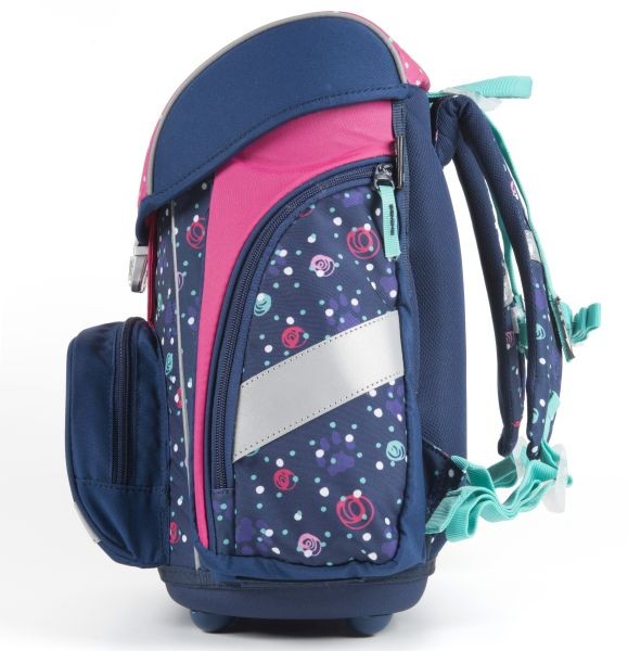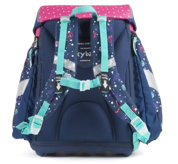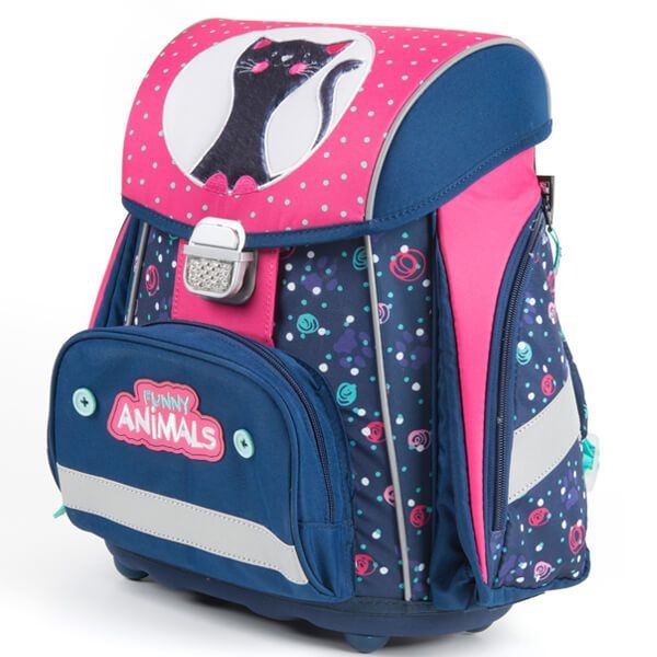 Mačičková školská aktovka pre prváčikov má anatomicky tvarovaný, polstrovaný chrbát a ramenné popruhy. Na nich nájdete prídavné priťahovacie pásky pre ešte lepšie usadenie tašky na chrbte a hrudný popruh brániaci skĺznutiu aktovky z ramien dieťaťa.