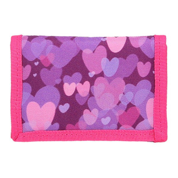 Textilná peňaženka so zapínaním na suchý zips obsahuje väčšiu a menšiu priehradku, kapsičku so zipsom na drobné a krúžok napr. na kľúče.