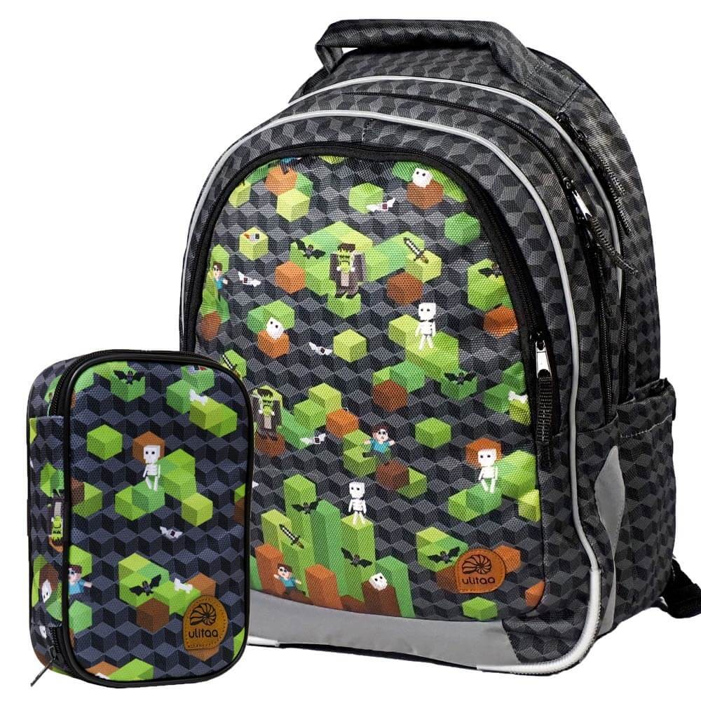 Školská taška v 2dielnom sete s obrázkami populárnych postavičiek inšpirovaných hrou Minecraft. Set pre chlapcov je zložený zo školského batohu a peračníka.