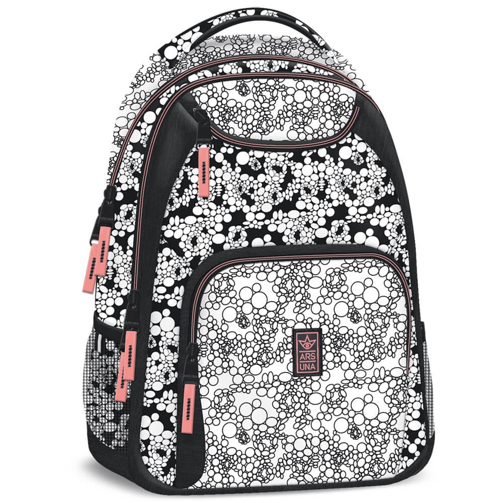 Ľahký dvojkomorový batoh s mnohými praktickými vrecami vhodný pre druhý stupeň ZŠ a študentky stredných a vysokých škôl. Batoh je vyrobený z prvotriedneho pevného materiálu v nápaditom bublinkovom motíve s pastelovo oranžovými detailmi, zipsy sú ľahko ovládateľné s dlhšími tiahlami.