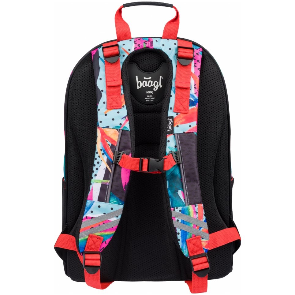 Trojkomorový školský batoh s reflexným nápisom Baagl na prednej zipsovej kapse. Batoh má anatomicky tvarovaný, mäkko polstrovaný chrbát i ramenné popruhy.