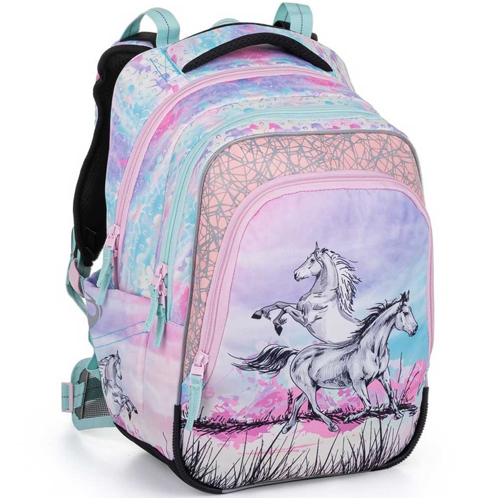 Ramenné popruhy sú anatomicky tvarované a mäkko polstrované. Súčasťou batohu je flexibilný hrudný pásik na fixáciu popruhov na ramenách školáka. Tento hrudný pásik môžete kedykoľvek zložiť. Flip systém v hornej časti ramenných popruhov drží popruhy v otvorenej polohe od chrbta batohu a zaistí tak pohodlné nasadenie batohu. Koncovky popruhov s reflexným prvkom a magnetom ľahko uchytíte na konce ramenného popruhu.