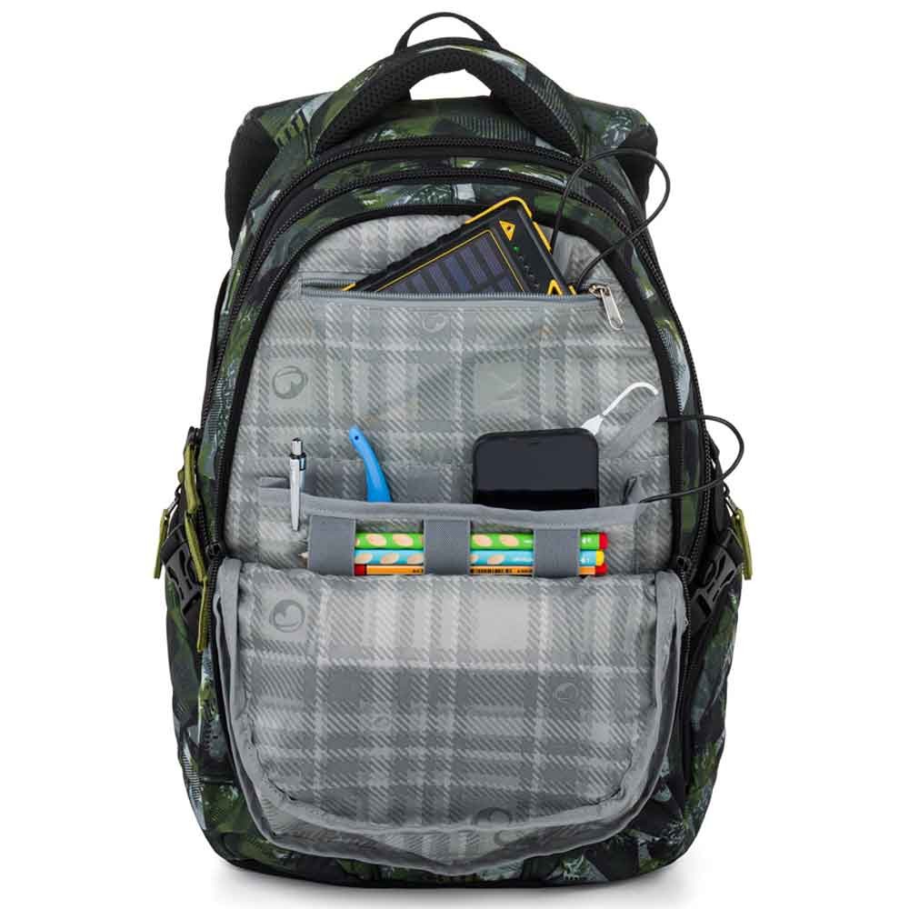 - Do hlavnej sa vojdú veľké školské dosky, učebnice a zošity formátu A4. V hlavnej komore je kompresná kapsa s elastickými bočnými pásmi na dosky A4 a veľké učebnice. Pomáha pritiahnuť a udržať ťažké pomôcky čo najbližšie k chrbtu, vďaka čomu má školák alebo školačka ťažisko blízko chrbtice a pri chôdzi sa nehrbí.