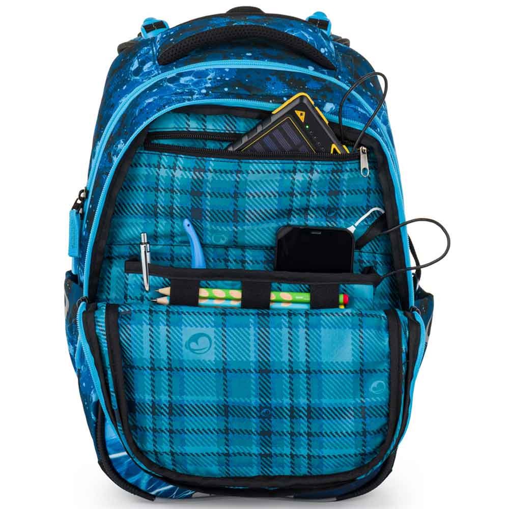 - Do hlavnej komory sa zmestia veľké školské dosky, učebnice aj zošity formátu A4. Komora obsahuje kompresné vrecko s elastickými bočnými pásmi, ktoré pomáha udržať ťažké pomôcky blízko chrbta a tým podporuje správne držanie tela pri chôdzi.