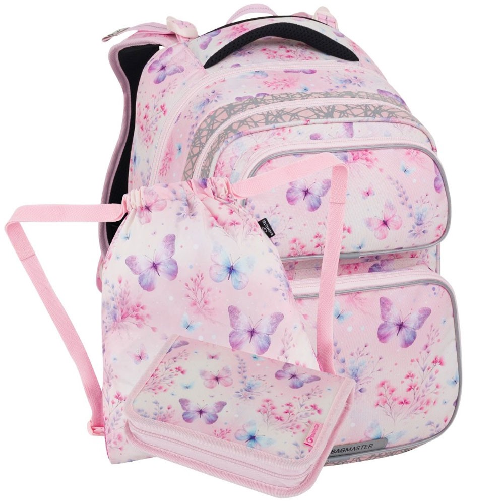 S ružovou dvojkomorovou školskou taškou s trblietavým dizajnom budú všetky malé dievčatá chodiť do školy s úsmevom. Vďaka precíznemu chrbtovému systému s bedrovým pásom a váhe pod kilogram je vhodný aj pre drobnejšie deti. Dievčenský batoh je ideálny do 1.-3. triedy. Je veľmi ľahký a šikovný. Na výšku má o niekoľko cm menej ako batohy Beta. Preto je vhodný pre školáčky s drobnou postavou, ktoré ale chcú radšej batoh ako aktovku. Má dve priestranné komory. Do hlavnej sa zmestia veľké školské dosky aj učebnice a zošity formátu A4. V hlavnej komore je tiež kompresné vrecko s elastickými postrannými pásmi na dosky A4 a na veľké učebnice. Na prednej strane batohu sú dve menšie vrecká na drobnosti, do spodného vrecka sa zmestí peračník alebo krabička na desiatu.