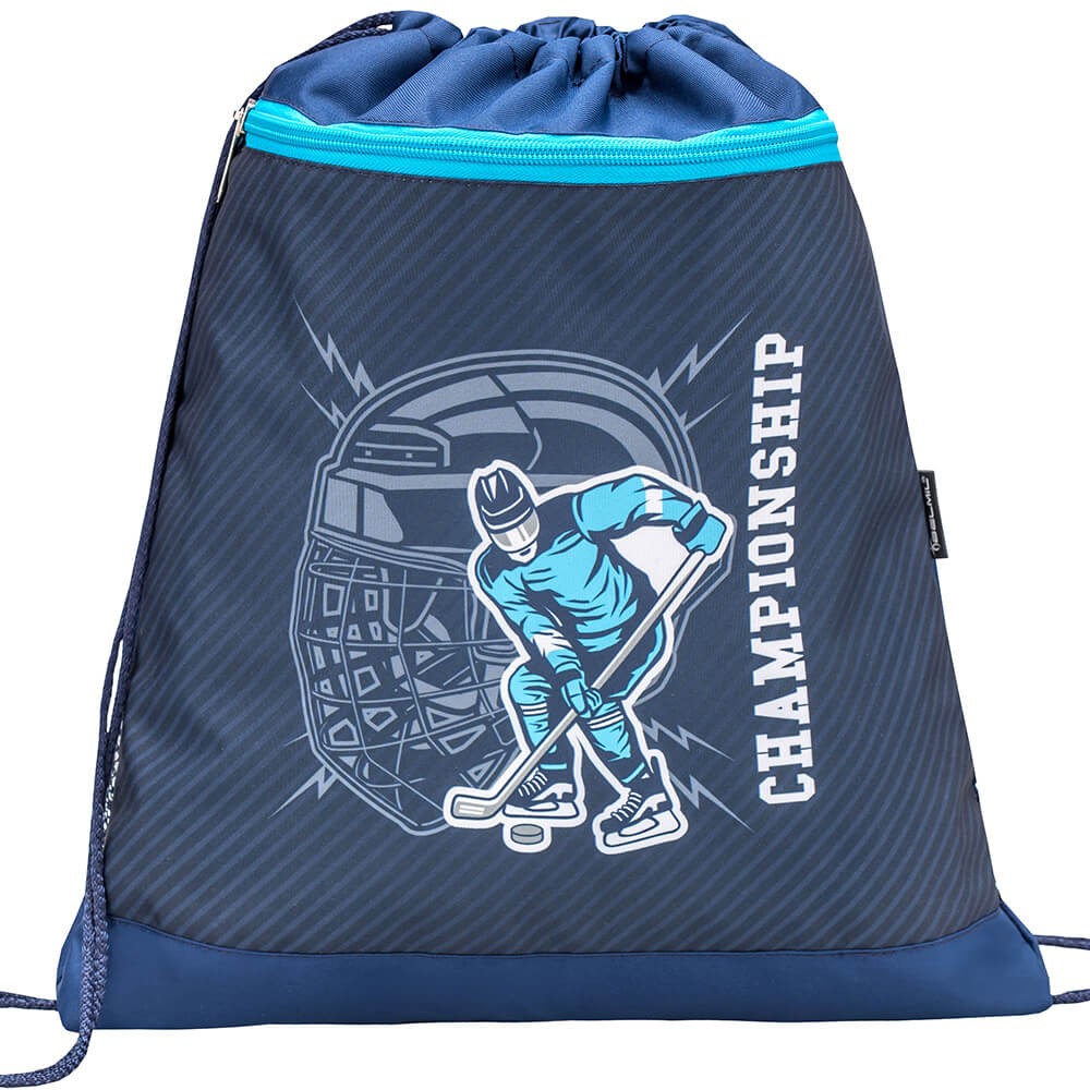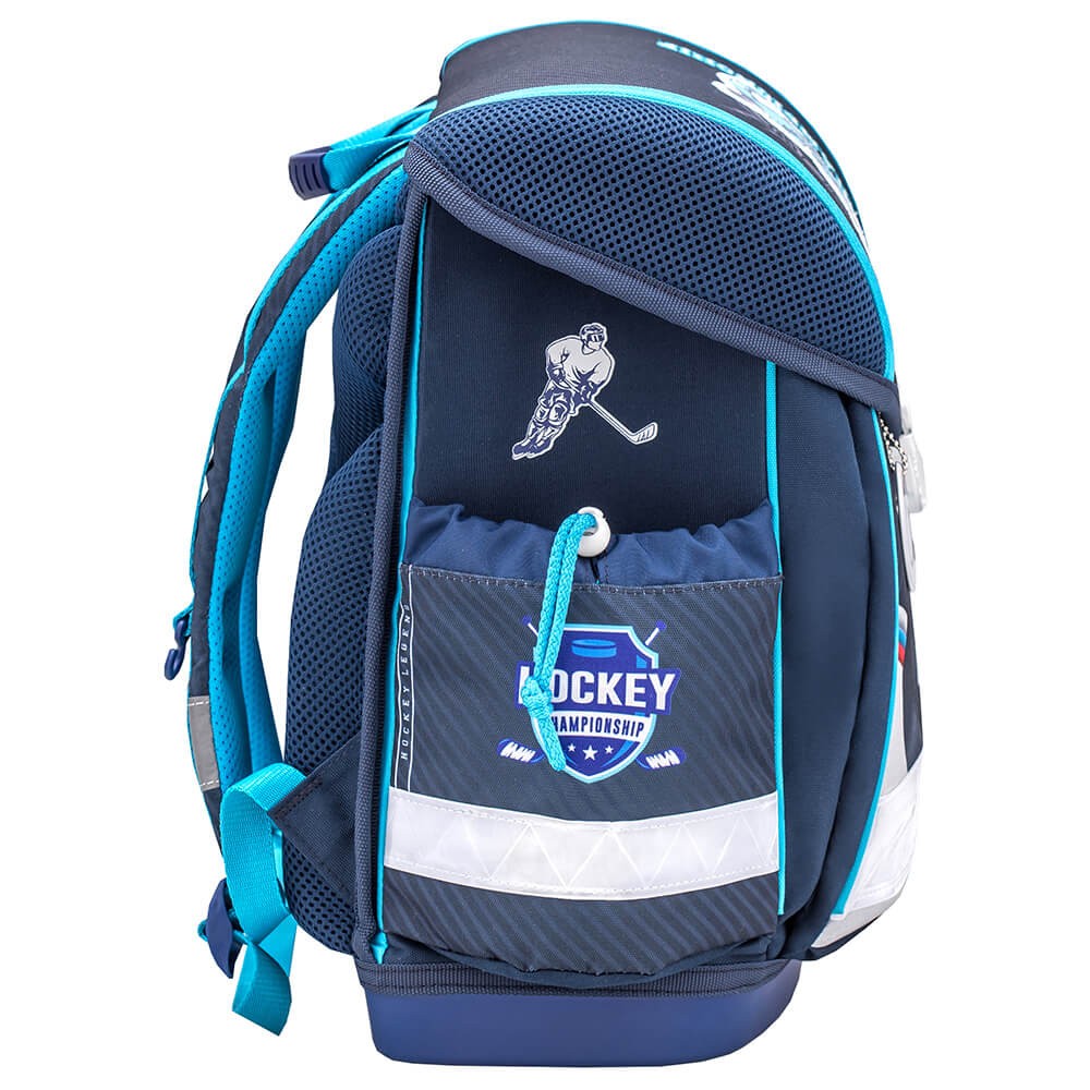 Školská aktovka vhodná pre prváčikov až tretiu triedu ZŠ s hokejovým motívom na modrom podklade. Klopu tašky zdobí obrázok hokejistu s brankárskou helmou na pozadí. Set tvorí taška, prázdny peračník a vrecko na cvičky rovnakého motívu.