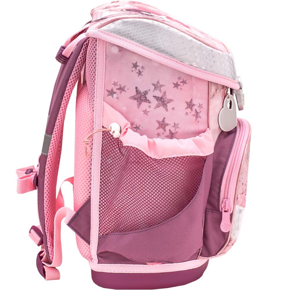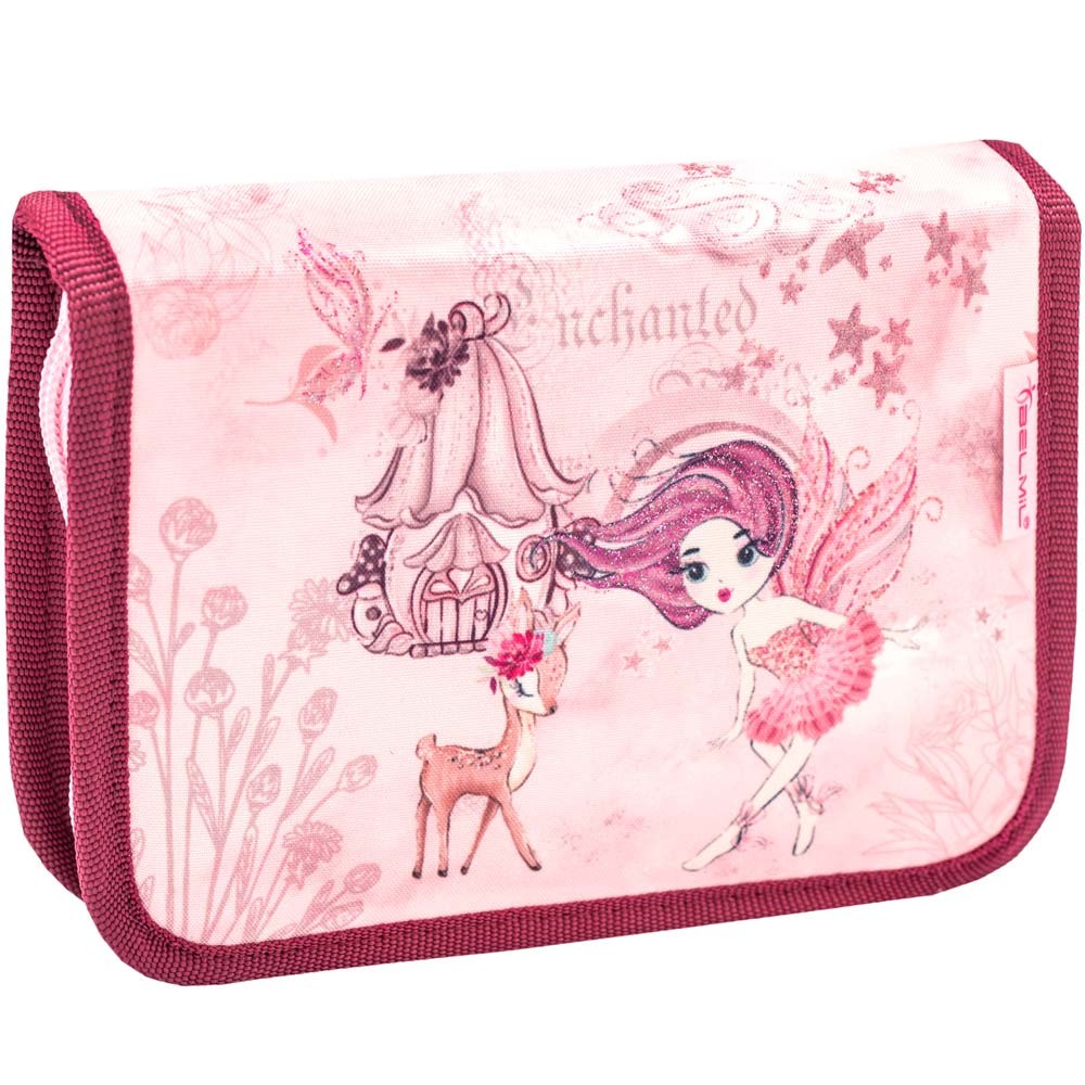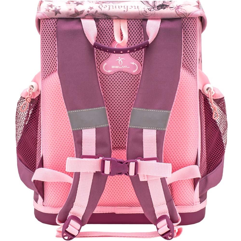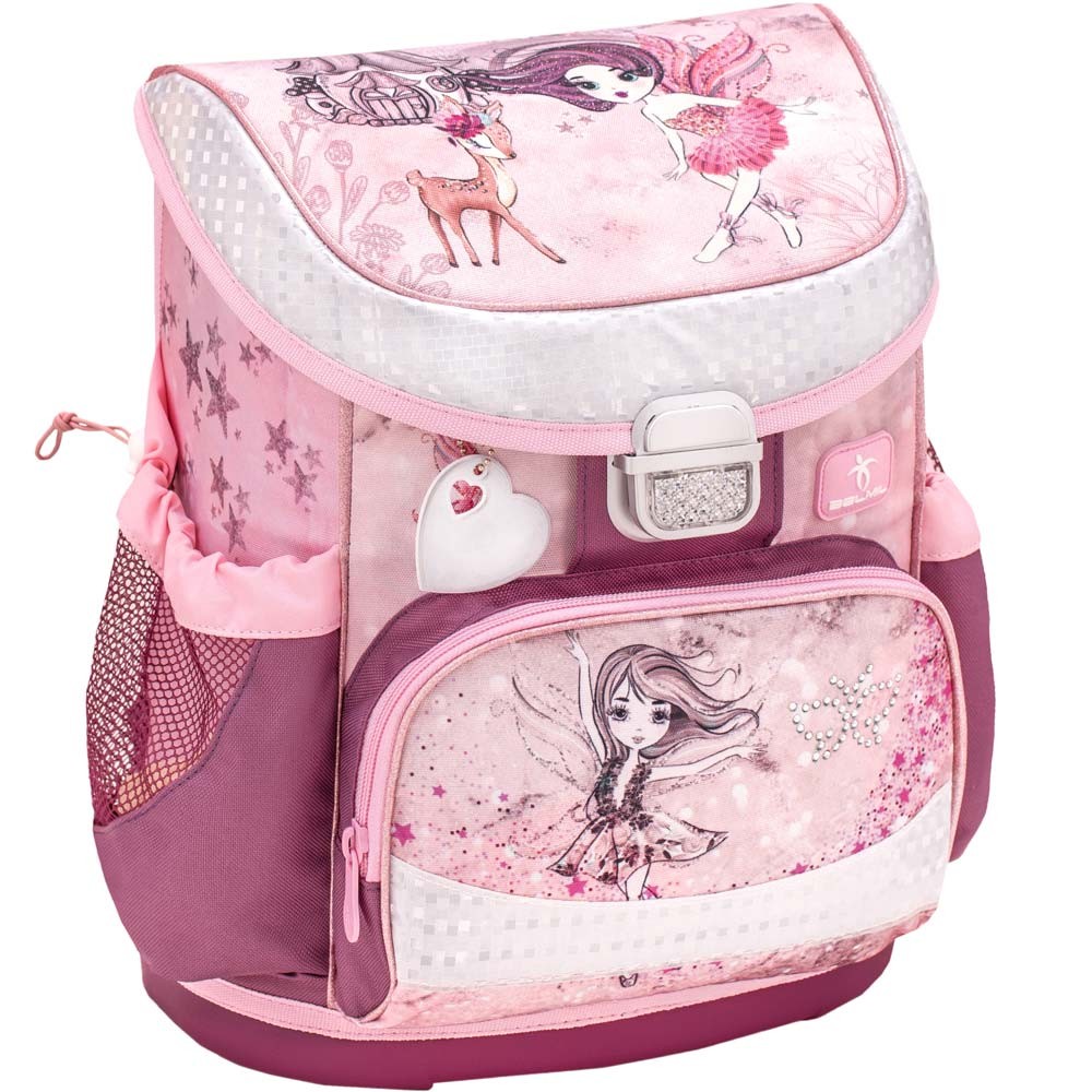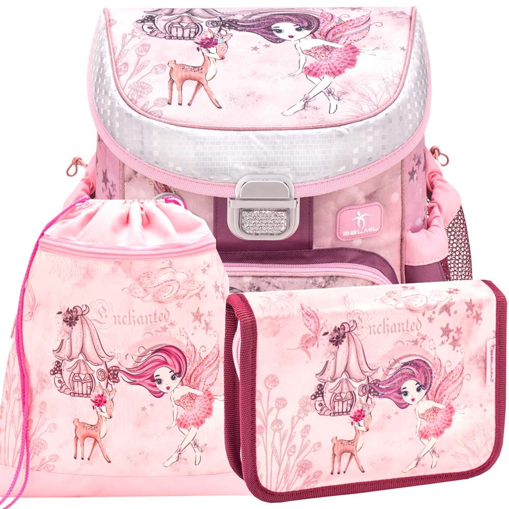 Ľahká školská taška Belmil s nežným motívom víly a srnky vhodná pre drobné deti od 1. do 3. triedy ZŠ. Set sa skladá z aktovky, peračníka a vrecka na prezúvky. Praktickým doplnkom je aj reflexný prívesok v tvare srdiečka.