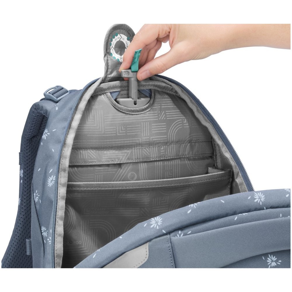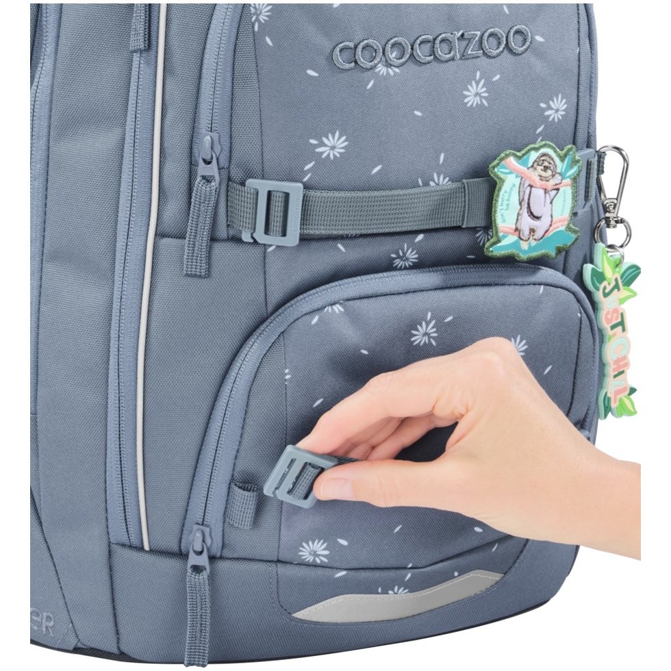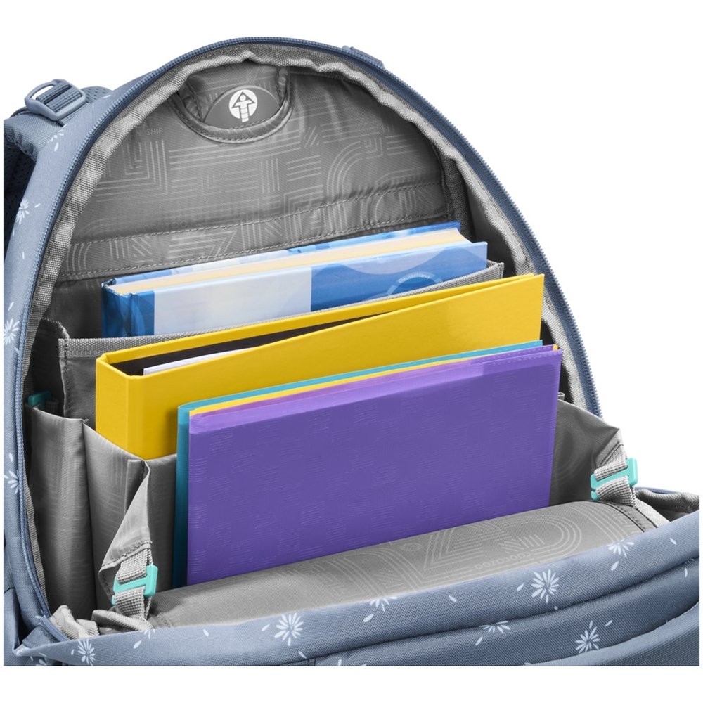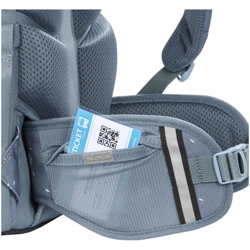 Malé sieťované vrecko na bedrovom páse, dve otvorené bočné vrecká rastúce smerom von, polstrovaná rukoväť a pútko na zavesenie a päť vreciek pre všetky školské potreby. Hlavné vrecko s priehradkou na knihy a odnímateľnou prepážkou, veľké vrecko, vrecko s organizérom a dve malé predné vrecká napr. pre desiatovú krabičku a drobné osobné veci a možnosť pripevnenia organizéru na tablet vo vnútri hlavného vrecka (predáva sa samostatne). Extra veľký prístup do hlavného vrecka pre lepší prehľad, stabilné pevné dno, reflexné prvky pre väčšiu bezpečnosť v cestnej premávke, v šere av tme a možnosť pripevnenia LED blikačky pre ešte väčšiu viditeľnosť.