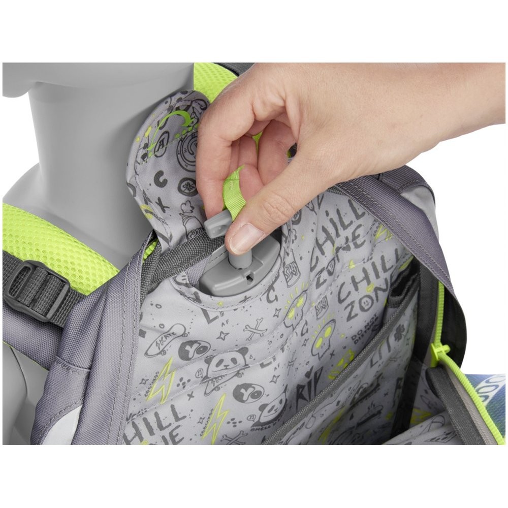 - možnosť plynulého výškového nastavenia ramenných popruhov pomocou otočného mechanizmu vnútri aktovky, zaisťuje presné nastavenie ramenných popruhov priamo na chrbte dieťaťa (ergonomické prispôsobenie podľa veľkosti chrbta)