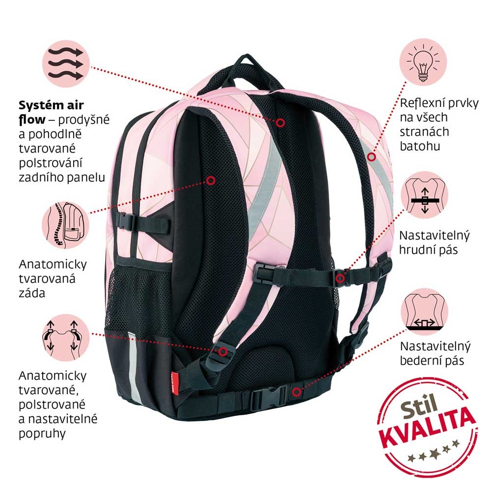 Batoh je anatomicky tvarovaný a má tri komory a jedno vrecko na drobnosti. Hlavná komora batohu obsahuje oddelené vrecko na uloženie dosiek na zošity av prednej komore je organizér na drobné predmety, kľúče a pod. Bočné sieťované vrecká sú určené na prenášanie fľaše na pitie. Systém Air Flow a priedušné polstrovanie umožní dobrú cirkuláciu vzduchu a príjemné nosenie. Polstrované nastaviteľné ramenné popruhy dopĺňajú hrudný popruh na zvýšenie komfortu pri nosení. Batoh je doplnený zo všetkých strán o reflexné prvky na zvýšenie bezpečnosti. Na prenášanie v ruke slúži mäkko polstrované madlo, na zavesenie potom textilné pútko.