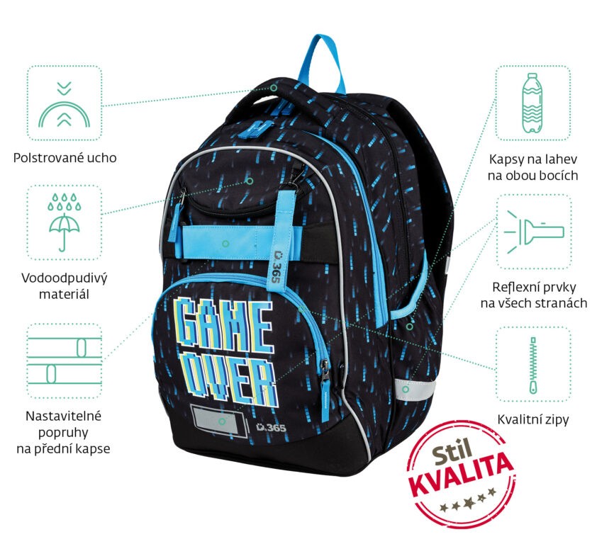 Batoh do školy Stil Smart Game Over je vhodný pre školákov od 3. triedy. Kvalitná anatomicky tvarovaná školská taška pre každého školáka.