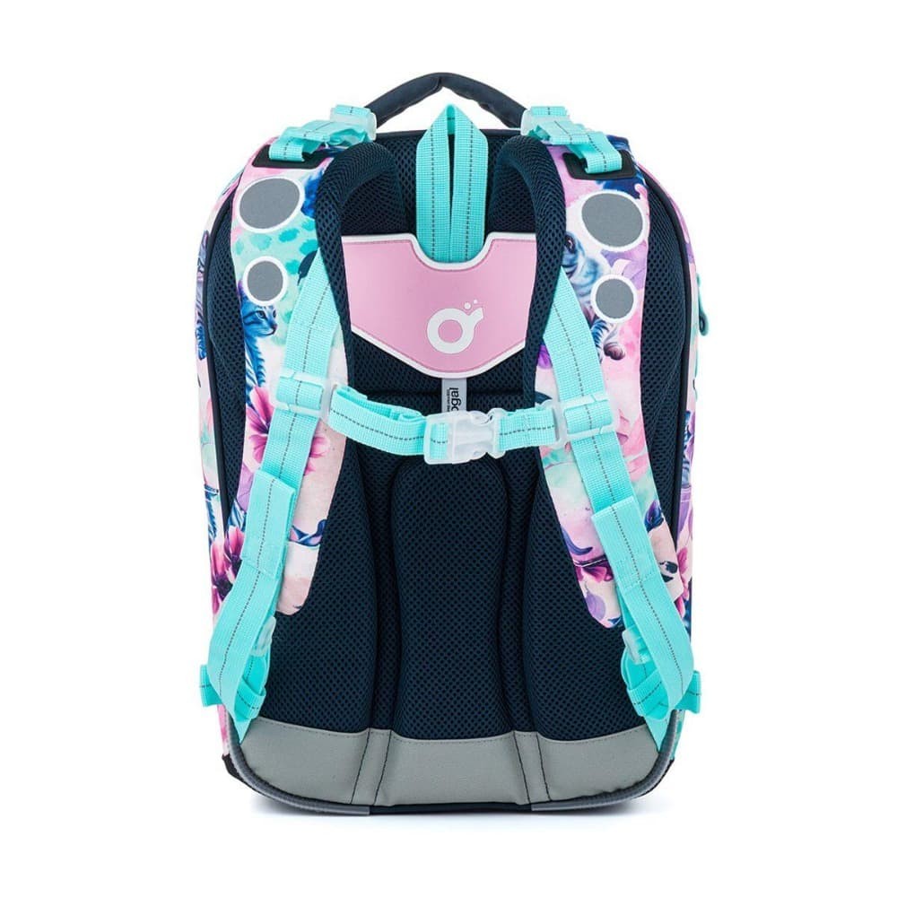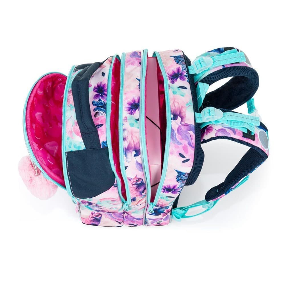 Batoh má ergonomicky tvarovaný chrbát a mäkko polstrované ramenné popruhy, ktoré sa ľahko prispôsobia postave dieťaťa. Vďaka výškovo nastaviteľnej hrudnej pracke batoh dobre drží na chrbte a nekĺže ani pri pohybe. Vnútorný priestor je rozdelený do viacerých komôr pre jednoduchú organizáciu školských pomôcok. Do zadnej časti batohu odporúčame uložiť ťažšie učebnice alebo dosky na zošity.