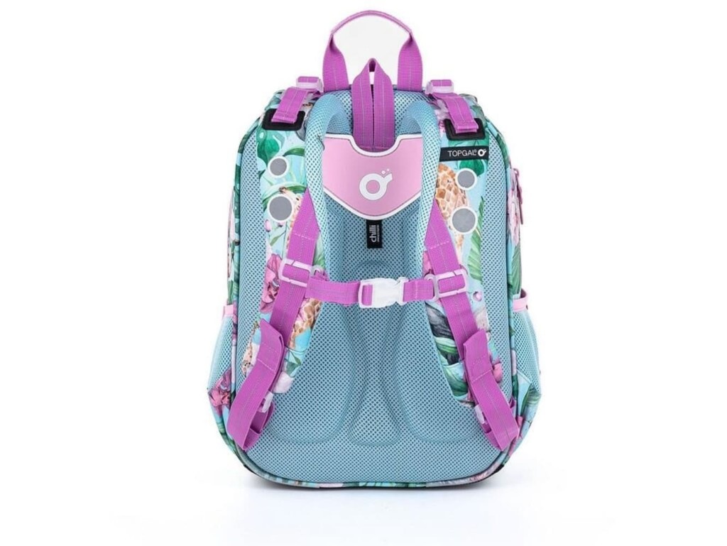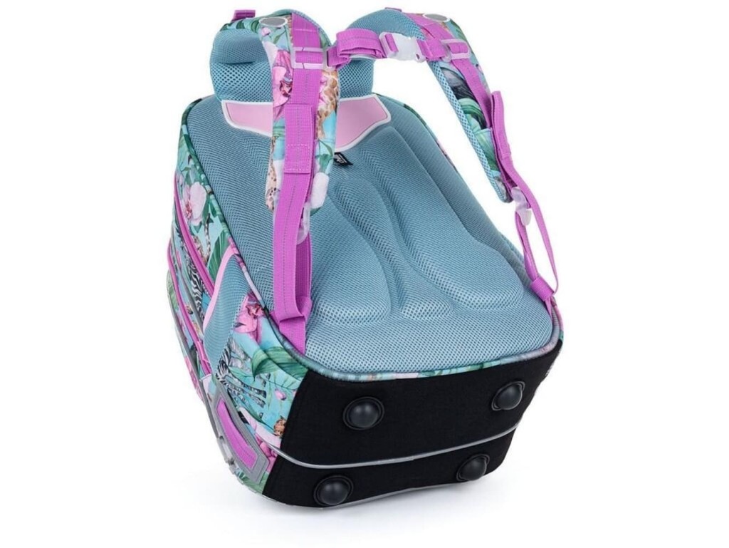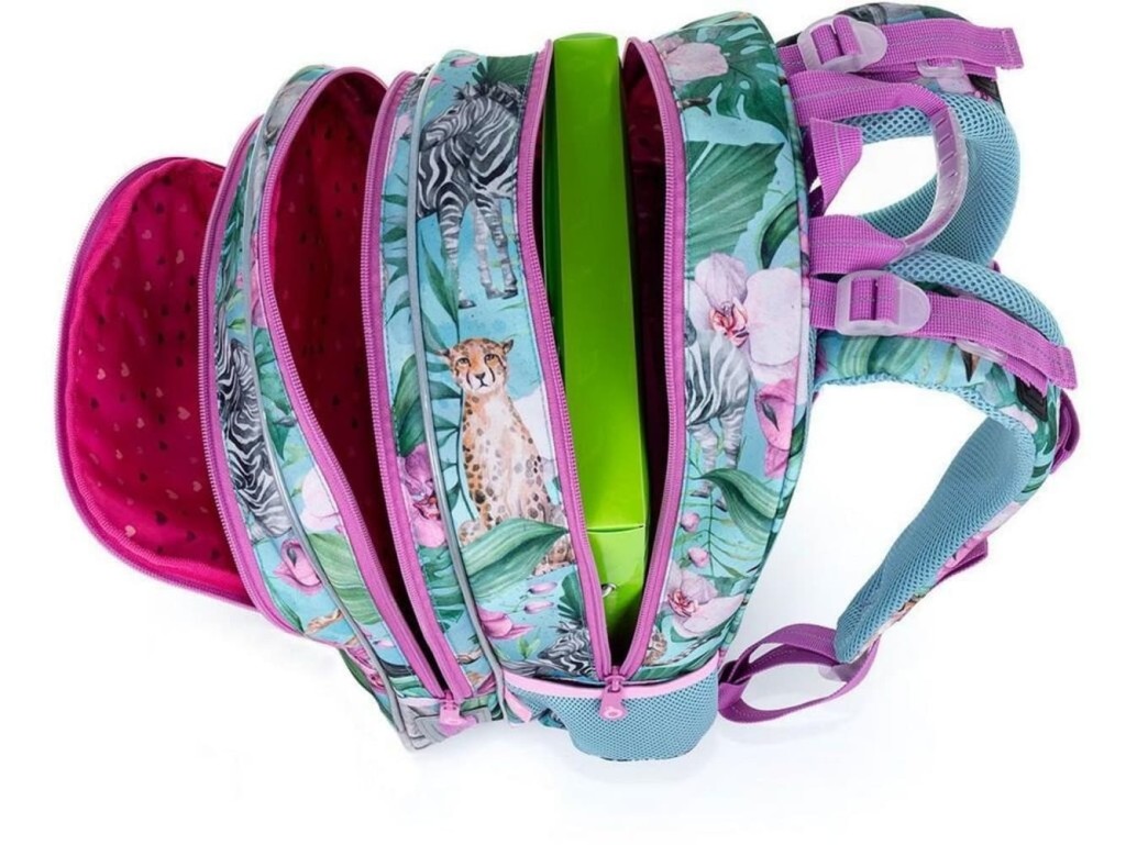 Tyrkysový batoh s ružovými zipsami, so zvieratkami zo safari a plyšovým srdiečkom ako príveskom. Model ELLY neváži ani kilogram, preto je ideálny pre dievčatá od prvého až do štvrtého ročníka ZŠ. Batoh má dve objemné hlavné komory. Zadná komora je objemnejšia a spoľahlivo pojme všetky učebnice. Predná komora je o niečo užšia a nachádza sa v nej ešte malé sieťované vrecko na zips a menovka. Predné hlboké vrecko pojme napr. peračník PENN 23004 v rovnakom dizajne alebo krabičku na desiatu. Do bočných vreciek sa zmestia fľaše s objemom 0,5 litra.