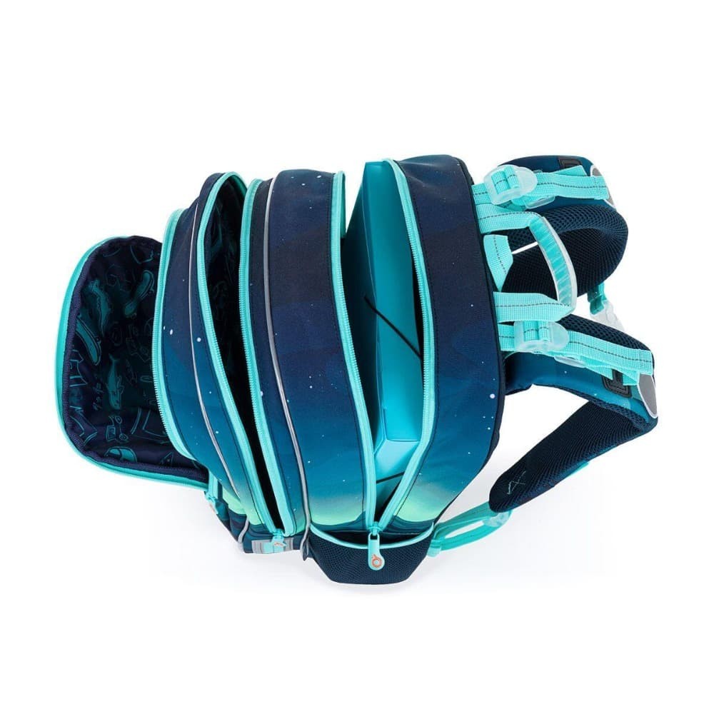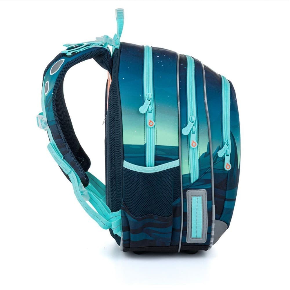 Do bočného vrecka sa pohodlne zmestí fľaša na pitie s objemom 0,5 litra. Batoh je vybavený reflexnými prvkami na prednej časti, bokoch aj ramenných popruhoch, ktoré zvyšujú bezpečnosť dieťaťa na ceste do školy. Spodná časť batohu je vyrobená z odolného materiálu TOPDURA, ktorý chráni batoh pred oderom a pomáha mu držať tvar aj pri každodennom školskom používaní.