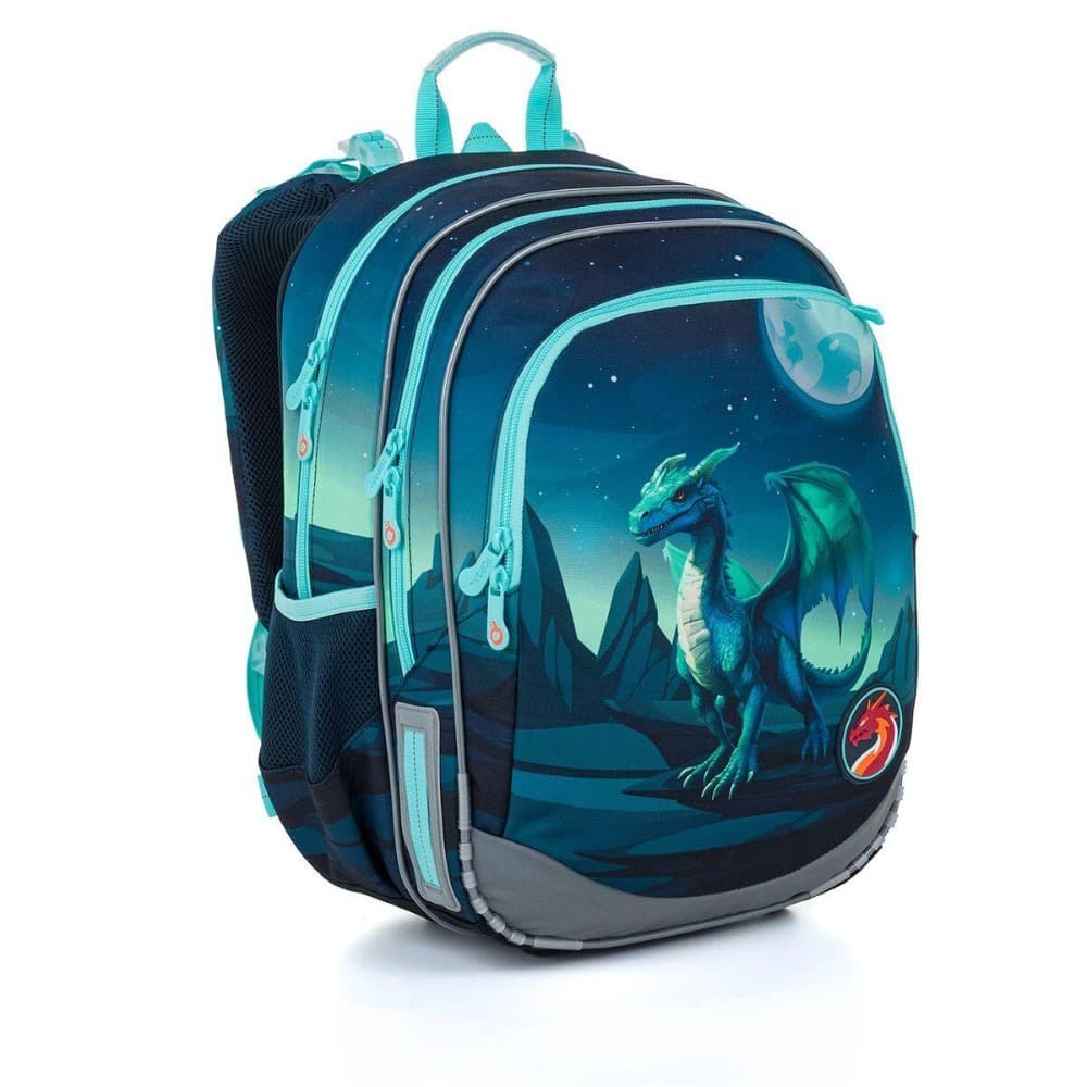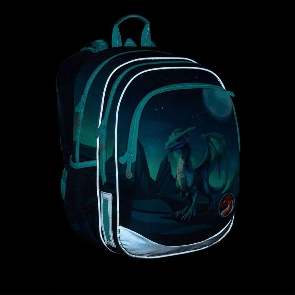 Školský batoh ELLY je vhodný pre školákov od 115 cm a ideálny pre obdobie od 1. do 4. ročníka ZŠ. Fantazijný motív draka v tmavo tyrkysových tónoch prenesie deti do sveta rozprávok a dobrodružstiev a urobí z každého školského dňa malú výpravu.