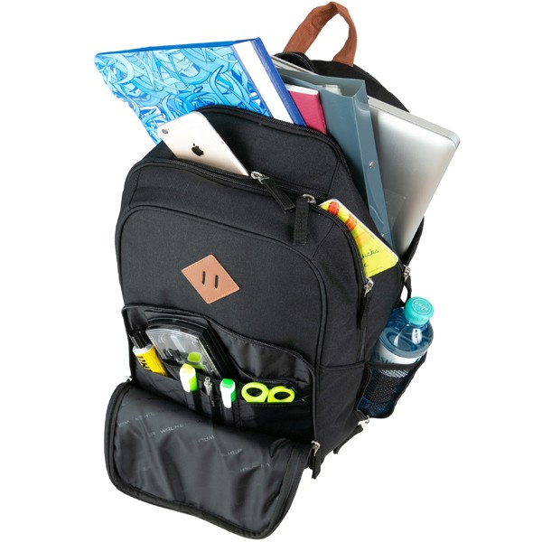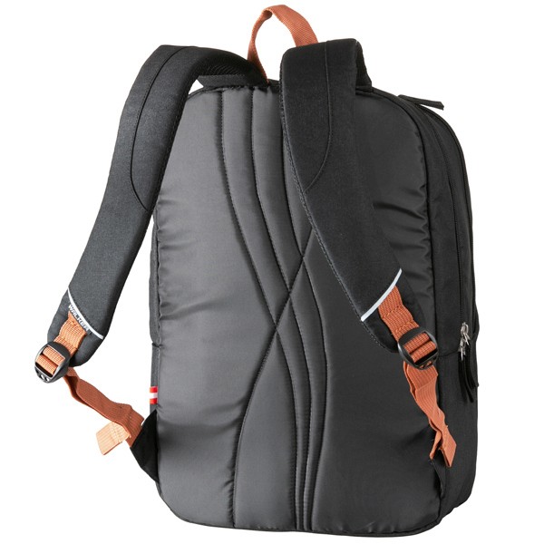 Veľká hlavná komora je členená vystuženým vreckom na tablet alebo laptop do veľkosti 15". Druhá komora je jednoduchá bez vnútorného členenia. Vo vnútri predného vrecka je bohato členený organizér s vnútorným vreckom na zips. Organizér tvorí vrecko na mobil, sieťované vrecko na zips a priehradky na písacie potreby. Obe komory sa uzatvárajú zipsom. Batoh je vybavený reflexnými paspulami zo všetkých strán pre lepšiu viditeľnosť. Chrbát batohu má polstrovanie pre pohodlné nosenie s ozdobným prešívaním. Na prenášanie batohu v rukách slúži pevné držadlo. Po oboch stranách sú rozšíriteľné bočné vrecká. Dno je vystužené, textilné.