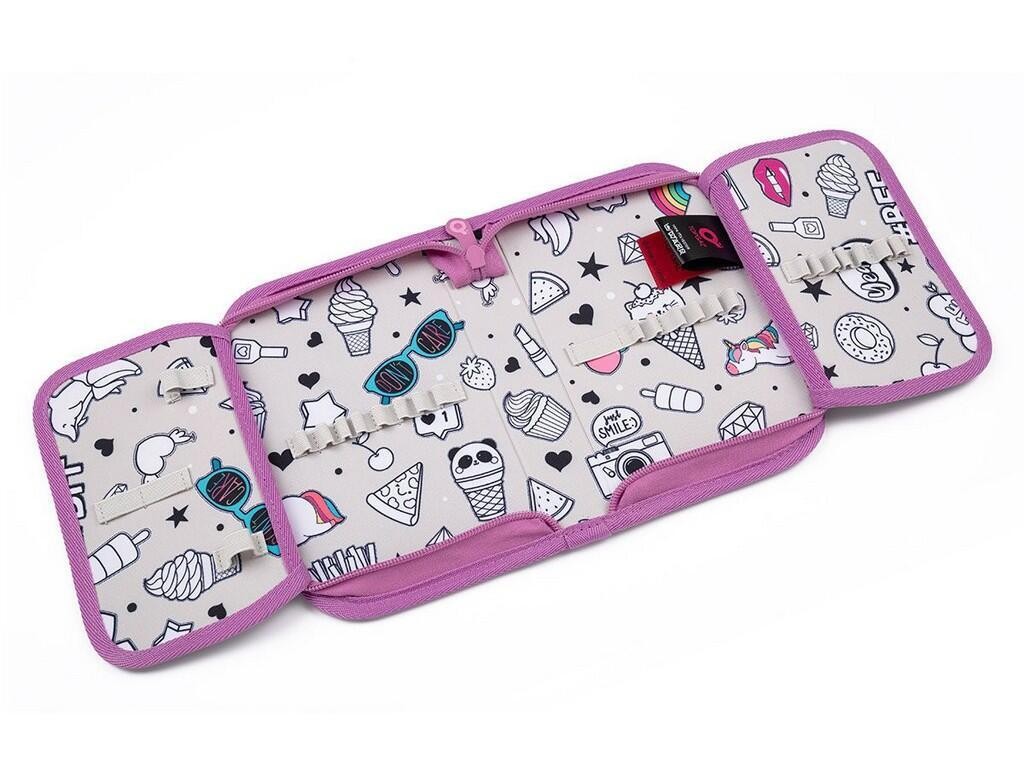 Jednoposchodový školský peračník s dvoma chlopňami je vybavené 21 klasickými gumovými úchytmi na pastelky a fixky, tromi širšími úchytmi na pravítko, kružidlo či nožnice a dvoma väčšími úchytmi na gumu a strúhadlo. Pod chlopňou z priehľadnej fólie nájdete rozvrh hodín, druhá poslúži napríklad aj na ťaháky.