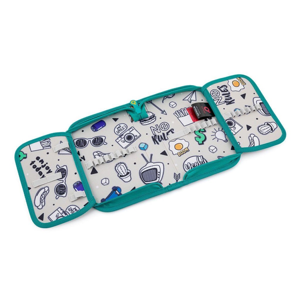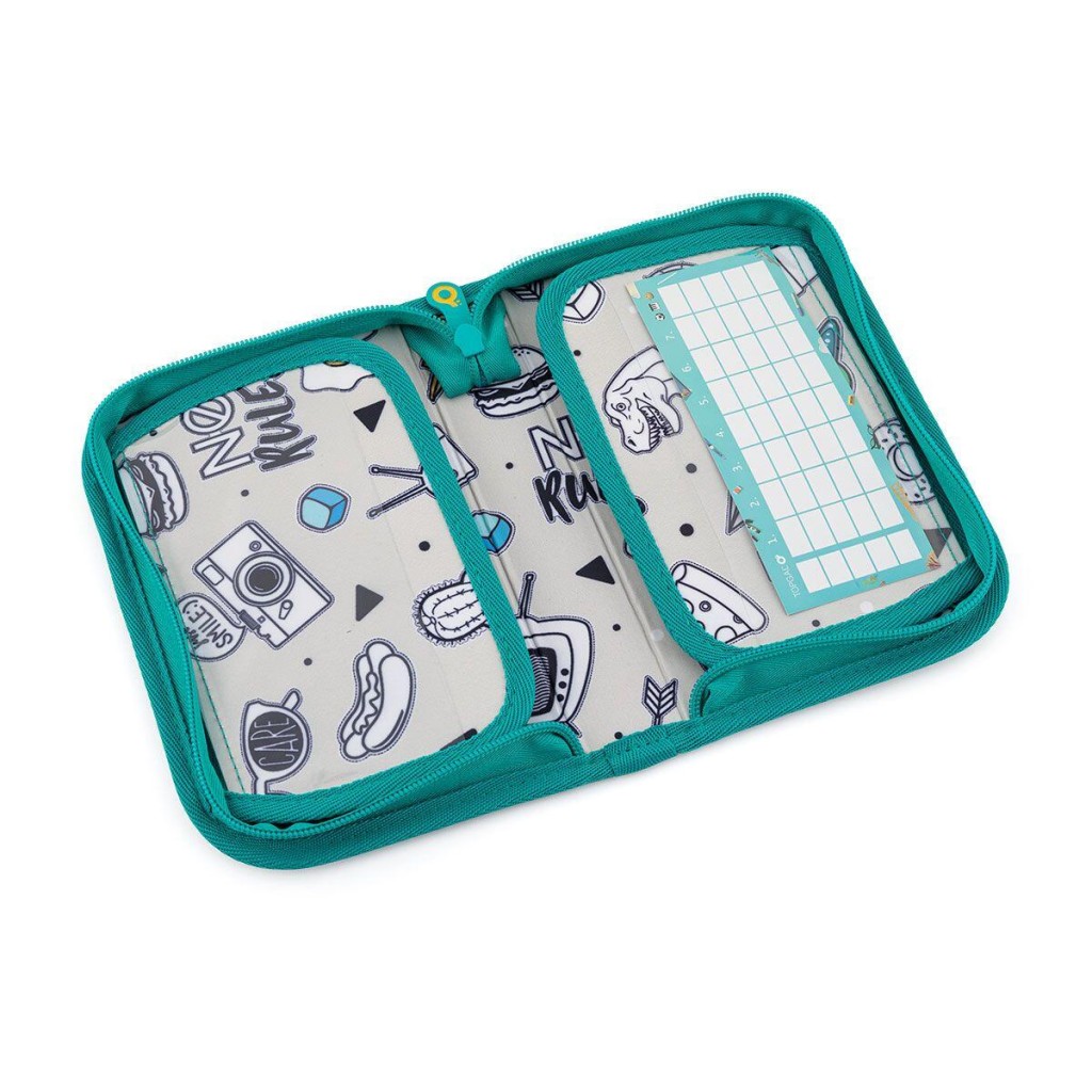 Jednoposchodový školský peračník s dvoma chlopňami je vybavené 21 klasickými gumovými úchytmi na pastelky a fixky, tromi širšími úchytmi na pravítko, kružidlo či nožnice a dvoma väčšími úchytmi na gumu a strúhadlo. Pod chlopňou z priehľadnej fólie nájdete rozvrh hodín, druhá poslúži napríklad aj na ťaháky.