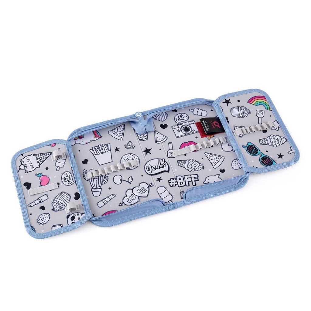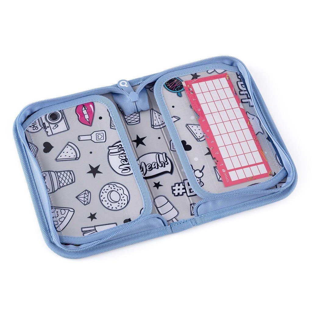 Jednoposchodový školský peračník s dvoma chlopňami je vybavené 21 klasickými gumovými úchytmi na pastelky a fixky, tromi širšími úchytmi na pravítko, kružidlo či nožnice a dvoma väčšími úchytmi na gumu a strúhadlo. Pod chlopňou z priehľadnej fólie nájdete rozvrh hodín, druhá poslúži napríklad aj na ťaháky.