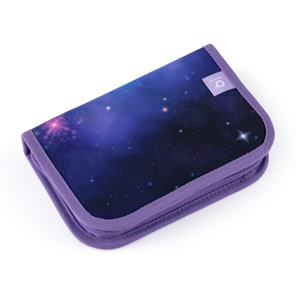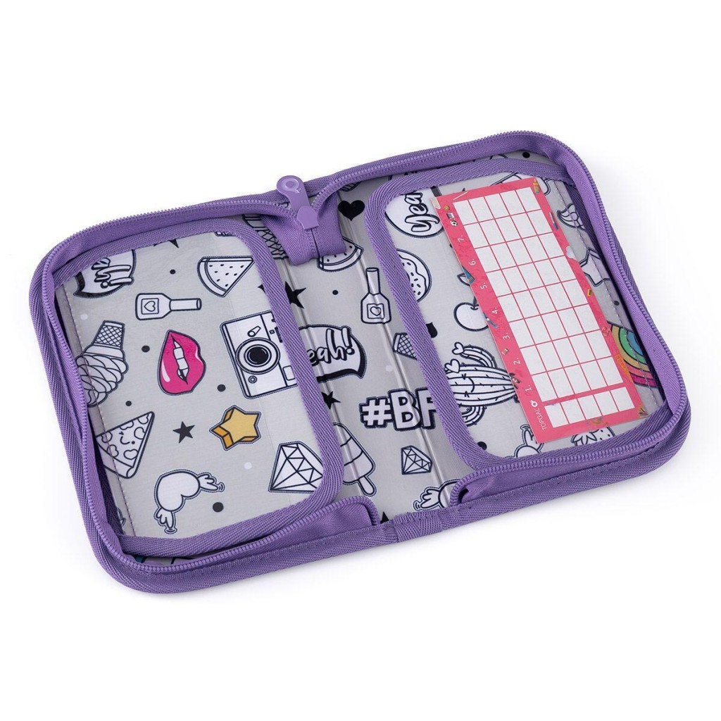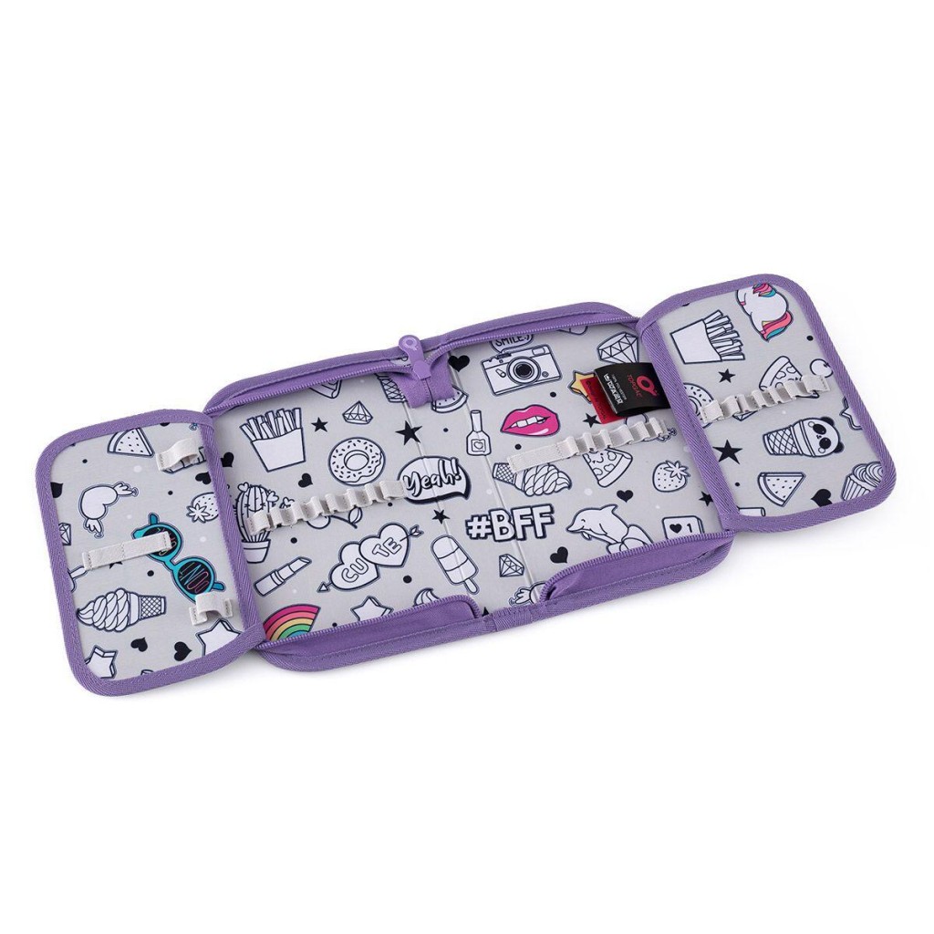 Jednoposchodový školský peračník s dvoma chlopňami je vybavené 21 klasickými gumovými úchytmi na pastelky a fixky, tromi širšími úchytmi na pravítko, kružidlo či nožnice a dvoma väčšími úchytmi na gumu a strúhadlo. Pod chlopňou z priehľadnej fólie nájdete rozvrh hodín, druhá poslúži napríklad aj na ťaháky.