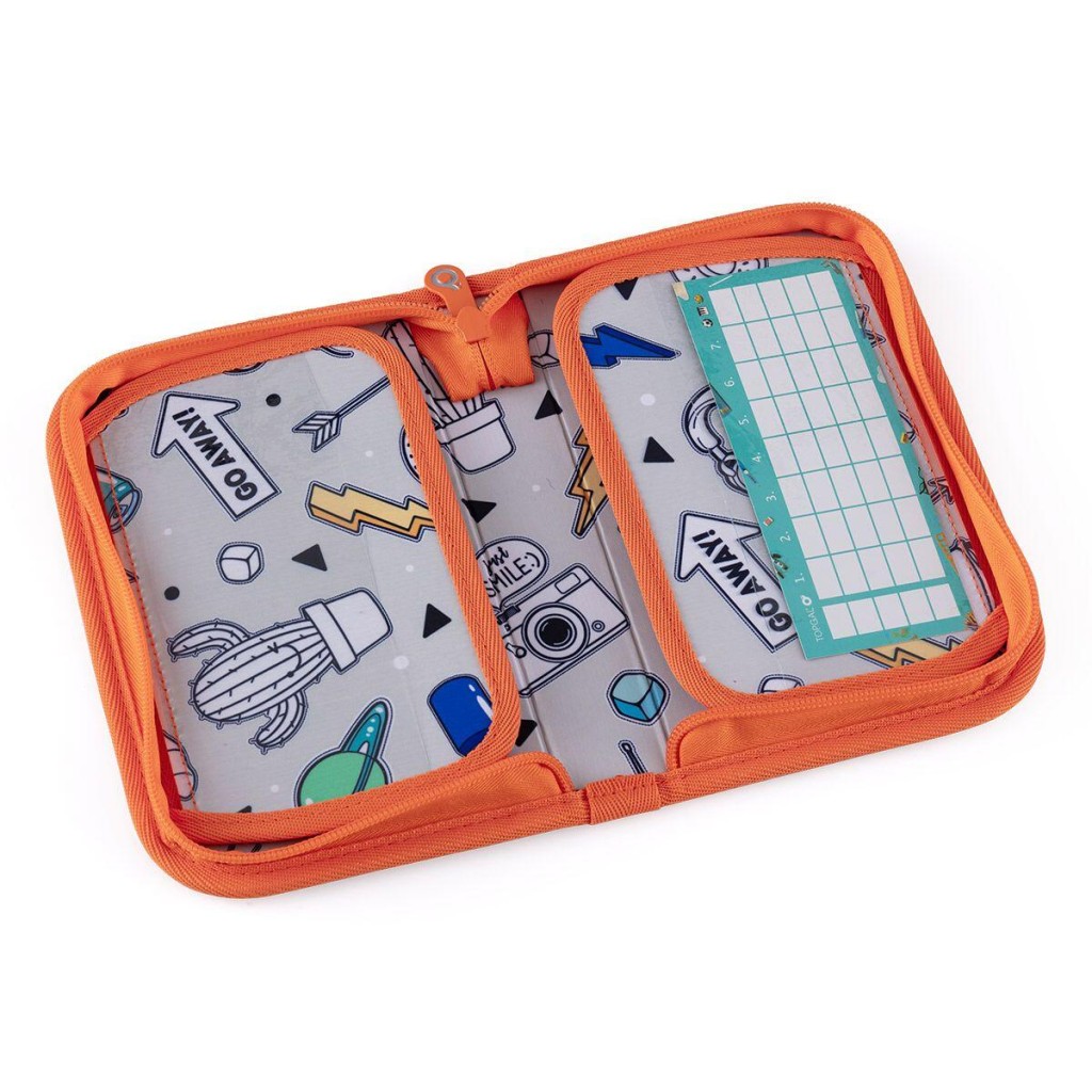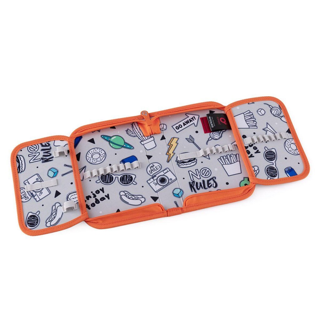 Jednoposchodový školský peračník s dvoma chlopňami je vybavené 21 klasickými gumovými úchytmi na pastelky a fixky, tromi širšími úchytmi na pravítko, kružidlo či nožnice a dvoma väčšími úchytmi na gumu a strúhadlo. Pod chlopňou z priehľadnej fólie nájdete rozvrh hodín, druhá poslúži napríklad aj na ťaháky.