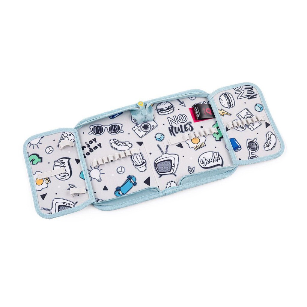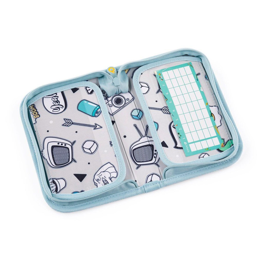 Jednoposchodový školský peračník s dvoma chlopňami je vybavené 21 klasickými gumovými úchytmi na pastelky a fixky, tromi širšími úchytmi na pravítko, kružidlo či nožnice a dvoma väčšími úchytmi na gumu a strúhadlo. Pod chlopňou z priehľadnej fólie nájdete rozvrh hodín, druhá poslúži napríklad aj na ťaháky.