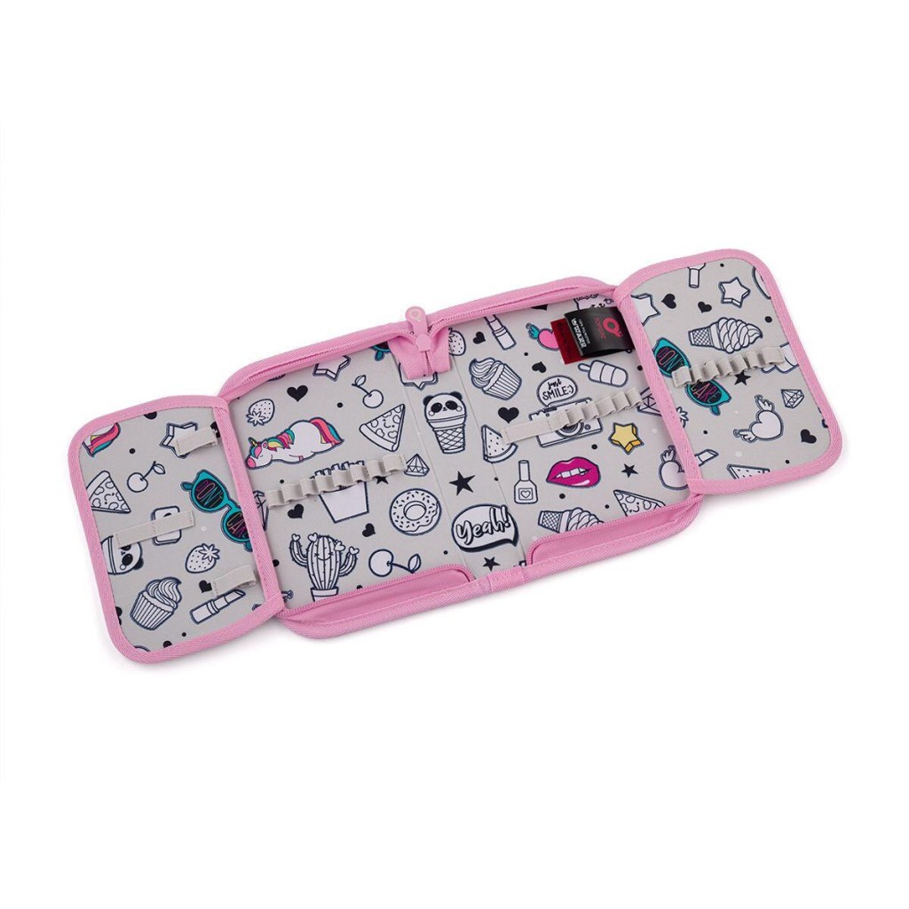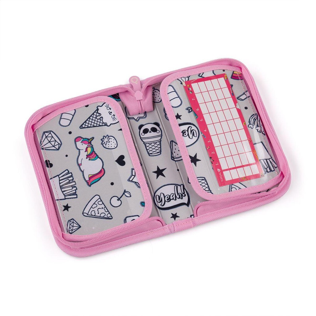 Jednoposchodový školský peračník s dvoma chlopňami je vybavené 21 klasickými gumovými úchytmi na pastelky a fixky, tromi širšími úchytmi na pravítko, kružidlo či nožnice a dvoma väčšími úchytmi na gumu a strúhadlo. Pod chlopňou z priehľadnej fólie nájdete rozvrh hodín, druhá poslúži napríklad aj na ťaháky.
